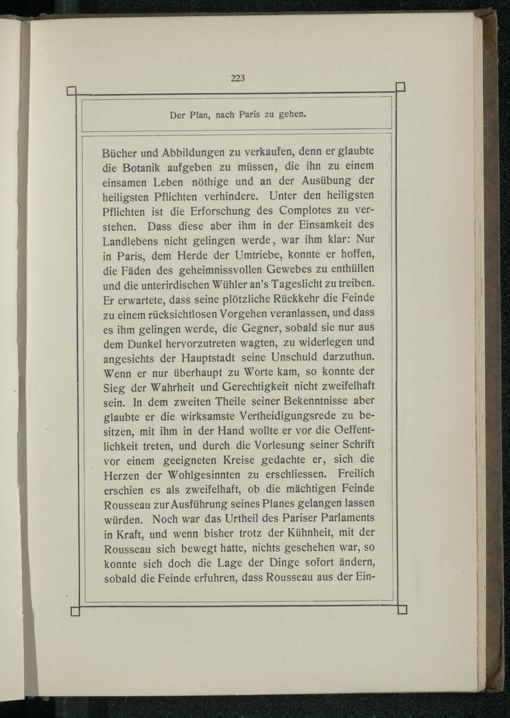 stehen. Dass diese aber ihm in der Einsamkeit des 4 Landlebens nicht gelingen werde, war ihm klar: Nur|| in Paris, dem Herde der Umtriebe, konnte er hoffen, | die Fäden des geheimnissvollen Gewebes zu enthüllen || und die unterirdischen Wühler an’s Tageslicht zu treiben.{4 ie Er erwartete, dass seine plötzliche Rückkehr die Feinde| fi zu einem rücksichtlosen Vorgehen veranlassen, und dass es ihm gelingen werde, die Gegner, sobald sie nur aus dem Dunkel hervorzutreten wagten, zu widerlegen und angesichts der Hauptstadt seine Unschuld darzuthun.| Wenn er nur überhaupt zu Worte kam, so konnte der| Sieg der Wahrheit und Gerechtigkeit nicht zweifelhaft|| sein. In dem zweiten Theile seiner Bekenntnisse aber glaubte er die wirksamste Vertheidigungsrede zu be-/ sitzen, mit ihm in der Hand wollte er vor die Oeffent-| lichkeit treten, und durch die Vorlesung seiner Schrift| 3 vor einem geeigneten Kreise gedachte er, sich die| . Herzen der Wohlgesinnten zu erschliessen. Freilich| N erschien es als zweifelhaft, ob die mächtigen Feinde/ 7 Rousseau zur Ausführung seines Planes gelangen lassen| % würden. Noch war das Urtheil des Pariser Parlaments| ) in Kraft, und wenn bisher trotz der Kühnheit, mit der/ Rousseau sich bewegt hatte, nichts geschehen war, So| konnte sich doch die Lage der Dinge sofort ändern,| sobald die Feinde erfuhren, dass Rousseau aus der Ein-|| 1| | | { | |