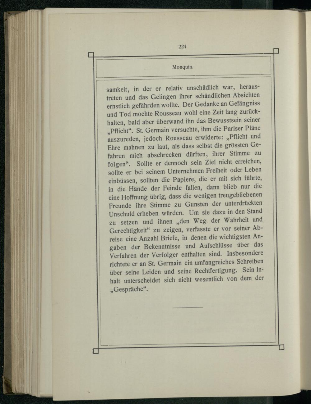 samkeit, in der er relativ unschädlich war, heraustreten und das Gelingen ihrer schändlichen Absichten ernstlich gefährden wollte. Der Gedanke an Gefängniss und Tod mochte Rousseau wohl eine Zeit lang zurückhalten, bald aber überwand ihn das Bewusstsein seiner „Pflicht“. St. Germain versuchte, ihm die Pariser Pläne auszureden, jedoch Rousseau erwiderte:„Pflicht und Ehre mahnen zu laut, als dass selbst die grössten Gefahren mich abschrecken dürften, ihrer Stimme zu folgen“. Sollte er dennoch sein Ziel nicht erreichen, sollte er bei seinem Unternehmen Freiheit oder Leben einbüssen, sollten die Papiere, die er mit sich führte, in die Hände der Feinde fallen, dann blieb nur die eine Hoffnung übrig, dass die wenigen treugebliebenen Freunde ihre Stimme zu Gunsten der unterdrückten Unschuld erheben würden. Um sie dazu in den Stand zu setzen und ihnen„den Weg. der Wahrheit und Gerechtigkeit“ zu zeigen, verfasste er vor seiner Abreise eine Anzahl Briefe, in denen die wichtigsten Angaben der Bekenntnisse und Aufschlüsse über das Verfahren der Verfolger enthalten sind. Insbesondere richtete er an St. Germain ein umfangreiches Schreiben über seine Leiden und seine Rechtfertigung. Sein Inhalt unterscheidet sich nicht wesentlich von dem der