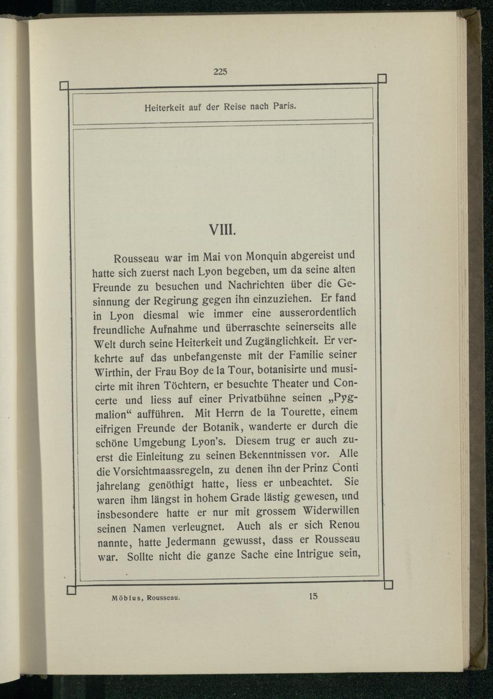 Rousseau war im Mai von Monquin abgereist und hatte sich zuerst nach Lyon begeben, um da seine alten Freunde zu besuchen und Nachrichten über die Gesinnung der Regirung gegen ihn einzuziehen. Er fand in Lyon diesmal wie immer eine ausserordentlich freundliche Aufnahme und überraschte seinerseits alle Welt durch seine Heiterkeit und Zugänglichkeit. Er verkehrte auf das unbefangenste mit der Familie seiner Wirthin, der Frau Boy de la Tour, botanisirte und musicirte mit ihren Töchtern, er besuchte Theater und Concerte und liess auf einer Privatbühne seinen„Pygmalion“ aufführen. Mit Herrn de la Tourette, einem eifrigen Freunde der Botanik, wanderte er durch die schöne Umgebung Lyon’s. Diesem trug er auch zuerst die Einleitung zu seinen Bekenntnissen vor. Alle die Vorsichtmaassregeln, zu denen ihn der Prinz Conti jahrelang genöthigt hatte, liess er unbeachtet. Sie waren ihm längst in hohem Grade lästig gewesen, und insbesondere hatte er nur mit grossem Widerwillen seinen Namen verleugnet. Auch als er sich Renou nannte, hatte Jedermann gewusst, dass er Rousseau war. Sollte nicht die ganze Sache eine Intrigue sein,