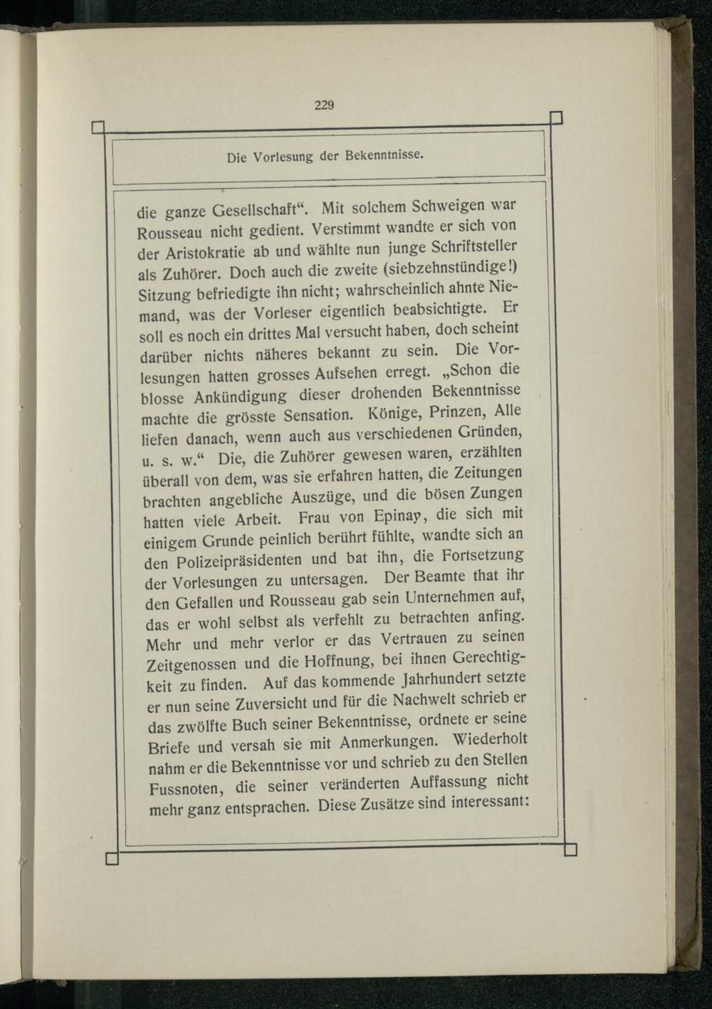 die ganze Gesellschaft“. Mit solchem Schweigen war Rousseau nicht gedient. Verstimmt wandte er sich von der Aristokratie ab und wählte nun junge Schriftsteller als Zuhörer. Doch auch die zweite(siebzehnstündige!) Sitzung befriedigte ihn nicht; wahrscheinlich ahnte Niemand, was der Vorleser eigentlich beabsichtigte. Er soll es noch ein drittes Mal versucht haben, doch scheint darüber nichts näheres bekannt zu sein. Die Vorlesungen hatten grosses Aufsehen erregt.„Schon die blosse Ankündigung dieser drohenden Bekenntnisse machte die grösste Sensation. Könige, Prinzen, Alle liefen danach, wenn auch aus verschiedenen Gründen, u. s. w.“ Die, die Zuhörer gewesen waren, erzählten überall von dem, was sie erfahren hatten, die Zeitungen brachten angebliche Auszüge, und die bösen Zungen hatten viele Arbeit. Frau von Epinay, die sich mit einigem Grunde peinlich berührt fühlte, wandte sich an den Polizeipräsidenten und bat ihn, die Fortsetzung der Vorlesungen zu untersagen. Der Beamte that ihr den Gefallen und Rousseau gab sein Unternehmen auf, das er wohl selbst als verfehlt zu betrachten anfing. Mehr und mehr verlor er das Vertrauen zu seinen Zeitgenossen und die Hoffnung, bei ihnen Gerechtigkeit zu finden. Auf das kommende Jahrhundert setzte er nun seine Zuversicht und für die Nachwelt schrieb er das zwölfte Buch seiner Bekenntnisse, ordnete er seine Briefe und versah sie mit Anmerkungen. Wiederholt nahm er die Bekenntnisse vor und schrieb zu den Stellen Fussnoten, die seiner veränderten Auffassung nicht mehr ganz entsprachen. Diese Zusätze sind interessant: