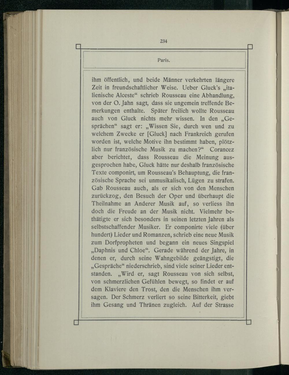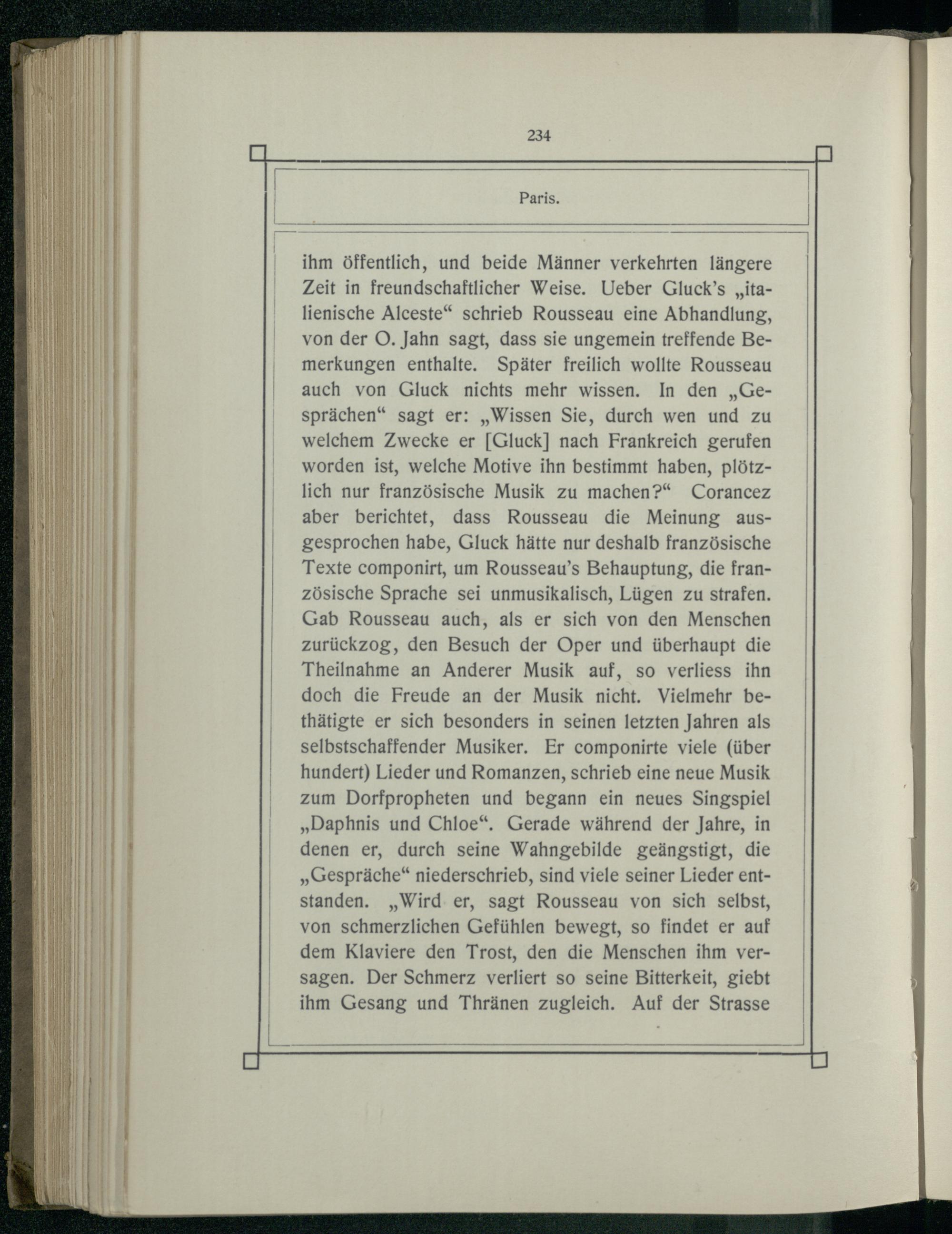 ihm öffentlich, und beide Männer verkehrten längere Zeit in freundschaftlicher Weise. Ueber Gluck’s„italienische Alceste“ schrieb Rousseau eine Abhandlung, von der O. Jahn sagt, dass sie ungemein treffende Bemerkungen enthalte. Später freilich wollte Rousseau auch von Gluck nichts mehr wissen. In den„Gesprächen“ sagt er:„Wissen Sie, durch wen und zu welchem Zwecke er[Gluck] nach Frankreich gerufen worden ist, welche Motive ihn bestimmt haben, plötzlich nur französische Musik zu machen?“ Corancez aber berichtet, dass Rousseau die Meinung ausgesprochen habe, Gluck hätte nur deshalb französische Texte componirt, um Rousseau’s Behauptung, die französische Sprache sei unmusikalisch, Lügen zu strafen. Gab Rousseau auch, als er sich von den Menschen zurückzog, den Besuch der Oper und überhaupt die Theilnahme an Anderer Musik auf, so verliess ihn doch die Freude an der Musik nicht. Vielmehr bethätigte er sich besonders in seinen letzten Jahren als selbstschaffender Musiker. Er componirte viele(über hundert) Lieder und Romanzen, schrieb eine neue Musik zum Dorfpropheten und begann ein neues Singspiel „Daphnis und Chloe“, Gerade während der Jahre, in denen er, durch seine Wahngebilde geängstigt, die „Gespräche“ niederschrieb, sind viele seiner Lieder entstanden.„Wird. er, sagt Rousseau von sich selbst, von schmerzlichen Gefühlen bewegt, so findet er auf dem Klaviere den Trost, den die Menschen ihm versagen. Der Schmerz verliert so seine Bitterkeit, giebt ihm Gesang und Thränen zugleich. Auf der Strasse