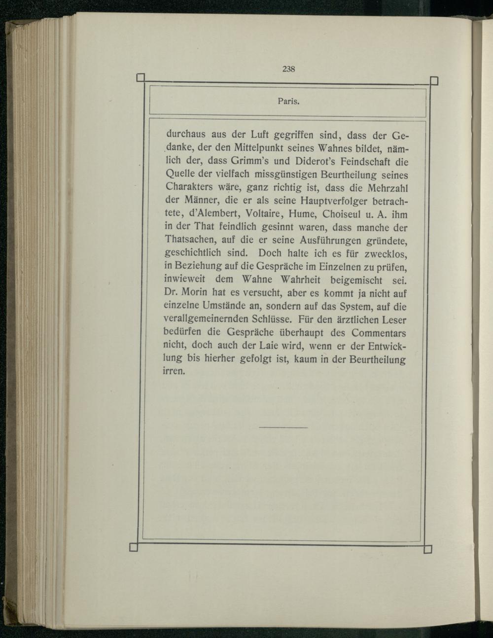 durchaus aus der Luft gegriffen sind, dass der Ge‚danke, der den Mittelpunkt seines Wahnes bildet, nämlich der, dass Grimm’s und Diderot’s Feindschaft die Quelle der vielfach missgünstigen Beurtheilung seines Charakters wäre, ganz richtig ist, dass die Mehrzahl der Männer, die er als seine Hauptverfolger betrachtete, d’Alembert, Voltaire, Hume, Choiseul u. A. ihm in der That feindlich gesinnt waren, dass manche der Thatsachen, auf die er seine Ausführungen gründete, geschichtlich sind. Doch halte ich es für zwecklos, in Beziehung auf die Gespräche im Einzelnen zu prüfen, inwieweit dem Wahne Wahrheit beigemischt sei. Dr. Morin hat es versucht, aber es kommt ja nicht auf einzelne Umstände an, sondern auf das Spstem, auf die