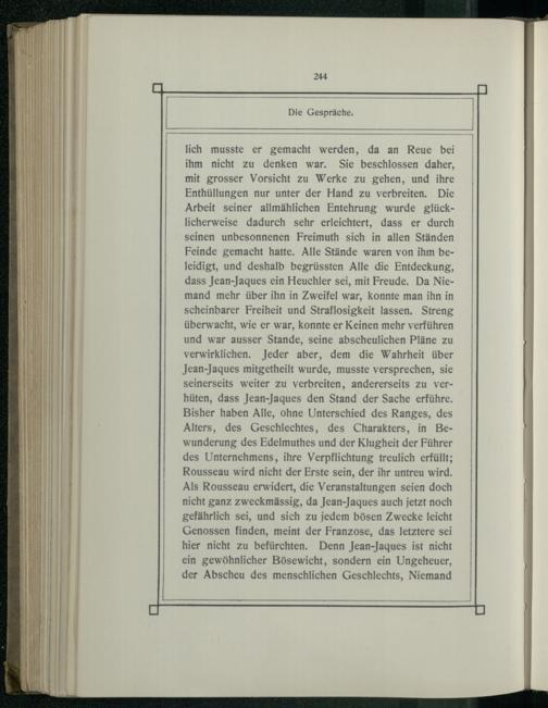 lich musste er gemacht werden, da an Reue bei ihm nicht zu denken war. Sie beschlossen daher, mit grosser Vorsicht zu Werke zu gehen, und ihre Enthüllungen nur unter der Hand zu verbreiten. Die Arbeit seiner allmählichen Entehrung wurde glücklicherweise dadurch sehr erleichtert, dass er durch seinen unbesonnenen Freimuth sich in allen Ständen Feinde gemacht hatte. Alle Stände waren von ihm beleidigt, und deshalb begrüssten Alle die Entdeckung, dass Jean-Jaques ein Heuchler sei, mit Freude. Da Niemand mehr über ihn in Zweifel war, konnte man ihn in scheinbarer Freiheit und Straflosigkeit lassen. Streng überwacht, wie er war, konnte er Keinen mehr verführen und war ausser Stande, seine abscheulichen Pläne zu verwirklichen. Jeder aber, dem die Wahrheit über Jean-Jaques mitgetheilt wurde, musste versprechen, sie seinerseits weiter zu verbreiten, andererseits zu verhüten, dass Jean-Jaques den Stand der Sache erführe. Bisher haben Alle, ohne Unterschied des Ranges, des Alters, des Geschlechtes, des Charakters, in Bewunderung des Edelmuthes und der Klugheit der Führer des Unternehmens, ihre Verpflichtung treulich erfüllt; Rousseau wird nicht der Erste sein, der ihr untreu wird. Als Rousseau erwidert, die Veranstaltungen seien doch nicht ganz zweckmässig, da Jean-Jaques auch jetzt noch gefährlich sei, und sich zu jedem bösen Zwecke leicht Genossen finden, meint der Franzose, das letztere sei hier nicht zu befürchten. Denn Jean-Jaques ist nicht ein gewöhnlicher Bösewicht, sondern ein Ungeheuer, der Abscheu des menschlichen Geschlechts, Niemand