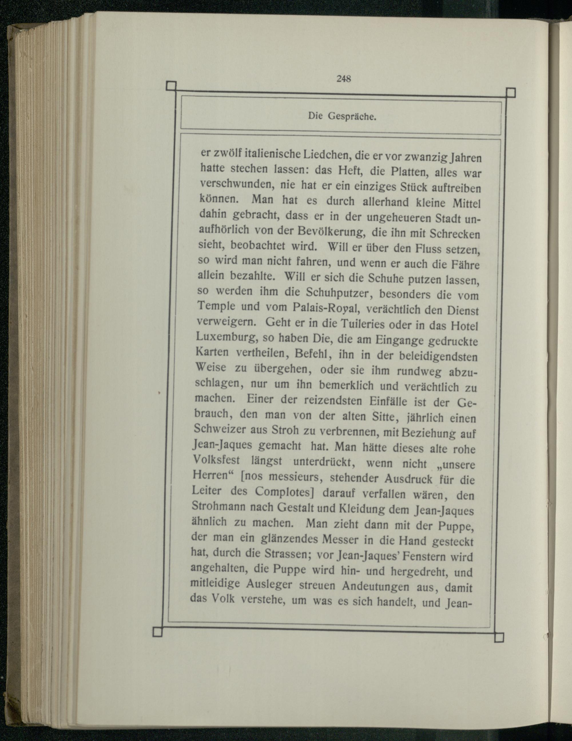 er zwölf italienische Liedchen, die er vor zwanzig Jahren hatte stechen lassen: das Heft, die Platten, alles war verschwunden, nie hat er ein einziges Stück auftreiben können. Man hat es durch allerhand kleine Mittel dahin gebracht, dass er in der ungeheueren Stadt unaufhörlich von der Bevölkerung, die ihn mit Schrecken sieht, beobachtet wird. Will er über den Fluss setzen, so wird man nicht fahren, und wenn er auch die Fähre allein bezahlte. Will er sich die Schuhe putzen lassen, so werden ihm die Schuhputzer, besonders die vom Temple und vom Palais-Royal, verächtlich den Dienst verweigern. Geht er in die Tuileries oder in das Hotel Luxemburg, so haben Die, die am Eingange gedruckte Karten vertheilen, Befehl, ihn in der beleidigendsten Weise zu übergehen, oder sie ihm rundweg abzuschlagen, nur um ihn bemerklich und verächtlich zu machen. Einer der reizendsten Einfälle ist der Gebrauch, den man von der alten Sitte, jährlich einen Schweizer aus Stroh zu verbrennen, mit Beziehung auf Jean-Jaques gemacht hat. Man hätte dieses alte rohe Volksfest längst unterdrückt, wenn nicht„Unsere Herren“[nos messieurs, stehender Ausdruck für die Leiter des Complotes] darauf verfallen wären, den Strohmann nach Gestalt und Kleidung dem Jean-Jaques ähnlich zu machen. Man zieht dann mit der Puppe, der man ein glänzendes Messer in die Hand gesteckt hat, durch die Strassen; vor Jean-Jaques’ Fenstern wird angehalten, die Puppe wird hin- und hergedreht, und mitleidige Ausleger streuen Andeutungen aus, damit das Volk verstehe, um was es sich handelt, und Jean