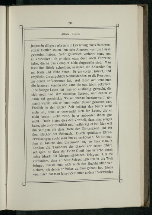 Jaques in effigie verbrenne in Erwartung eines Besseren. Sogar Bettler sollen ihm sein Almosen vor die Füsse geworfen haben. Sehr geistreich verfährt man, um zu entdecken, ob er nicht etwa doch noch Vertraute habe, die in das Complot nicht eingeweiht sind. Man lässt ihm Briefe schreiben, in denen die Absender ihn um Rath und Hilfe bitten. Er antwortet, tröstet, und empfiehlt die angeblich Nothleidenden an die Personen, zu denen er Vertrauen hat. Auf diese Art lernt man die letzteren kennen und kann sie nun leicht bekehren. Eine Menge Leute hat man so ausfindig gemacht, die sich noch von ihm täuschen liessen, und denen er dann auf geschickte Weise ebenso hassenswerth gemacht wurde, wie er ihnen vorher theuer gewesen war. Freilich in der letzten Zeit schlägt das Mittel nicht mehr an, denn er verwendet sich für Leute, die er nicht kennt, nicht mehr, ja er antwortet ihnen gar nicht. Doch bietet dies den Vortheil, dass man zeigen kann, wie unempfindlich und hartherzig er ist. Man will ihn sättigen mit dem Brote der Ehrlosigkeit und mit dem Becher der Schmach. Durch spöttische Ehrenerweisungen sucht man ihn zu verhöhnen. So bot man ihm in Amiens den Ehrenwein an, SO liess man» in London die Tambours der Garde vor seiner Thüre schlagen, so liess der Prinz Conti ihm in Trye durch seine Musik ein Morgenständchen bringen. Um zu verhindern, dass er neue Schlechtigkeiten in die Welt bringe, musste man sich auch der Buchhändler versichern, mit denen er früher zu thun gehabt hat. Einen von ihnen hat man lange Zeit unter anderen Vorwänden