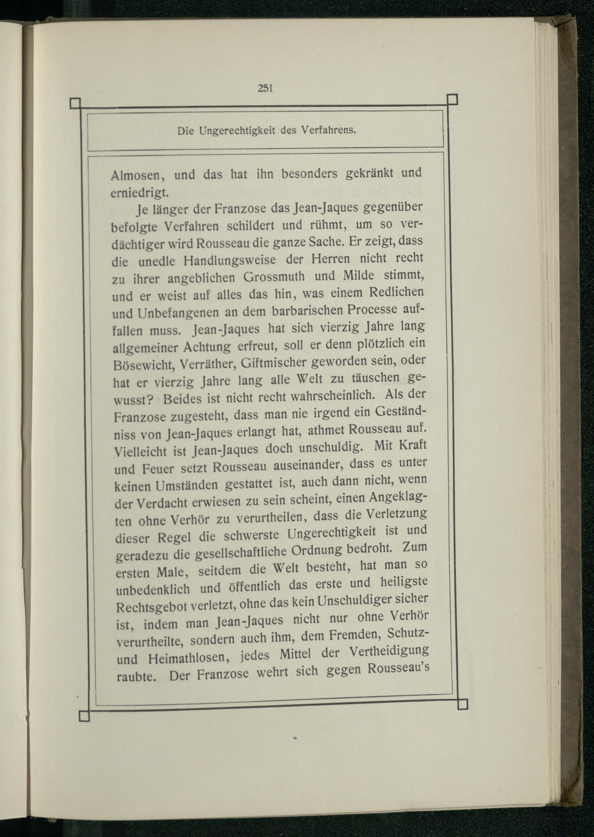 Je länger der Franzose das Jean-Jaques gegenüber befolgte Verfahren schildert und rühmt, um so Vverdächtiger wird Rousseau die ganze Sache. Er zeigt, dass die unedie Handlungsweise der Herren nicht recht zu ihrer angeblichen Grossmuth und Milde stimmt, und er weist auf alles das hin, was einem Redlichen und Unbefangenen an dem barbarischen Processe auffallen muss. Jean-Jaques hat sich vierzig Jahre lang allgemeiner Achtung erfreut, soll er denn plötzlich ein Bösewicht, Verräther, Giftmischer geworden sein, oder hat er vierzig Jahre lang alle Welt zu täuschen gewusst?| Beides ist nicht recht wahrscheinlich. Als der Franzose zugesteht, dass man nie irgend ein Geständniss von Jean-Jaques erlangt hat, athmet Rousseau auf. Vielleicht ist Jean-Jaques doch unschuldig. Mit Kraft und Feuer setzt Rousseau auseinander, dass es unter keinen Umständen gestattet ist, auch dann nicht, wenn der Verdacht erwiesen zu sein scheint, einen Angeklagten ohne Verhör zu verurtheilen, dass die Verletzung dieser Regel die schwerste Ungerechtigkeit ist und geradezu die gesellschaftliche Ordnung bedroht. Zum ersten Male, seitdem die Welt besteht, hat man SO unbedenklich und öffentlich das erste und heiligste Rechtsgebot verletzt, ohne das kein Unschuldiger sicher ist, indem man Jean-Jaques nicht nur ohne Verhör verurtheilte, sondern auch ihm, dem Fremden, Schutzund Heimathlosen, jedes Mittel der Vertheidigung raubte. Der Franzose wehrt sich gegen Rousseauw’s