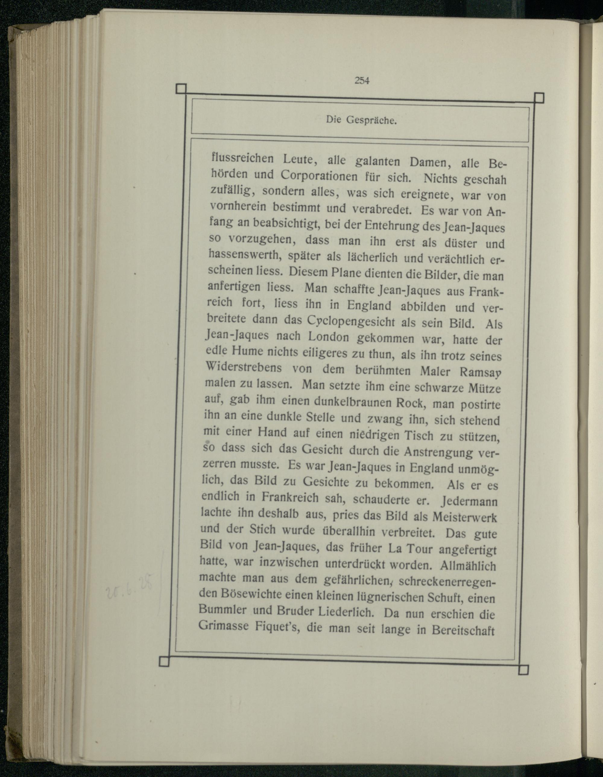 flussreichen Leute, alle galanten Damen, alle Behörden und Corporationen für sich. Nichts geschah zufällig, sondern alles, was sich ereignete, war von vornherein bestimmt und verabredet. Es war von Anfang an beabsichtigt, bei der Entehrung des Jean-Jaques So vorzugehen, dass man ihn erst als düster und hassenswerth, später als lächerlich und verächtlich erscheinen liess, Diesem Plane dienten die Bilder, die man anfertigen liess. Man schaffte Jean-Jaques aus Frankreich fort, liess ihn in England abbilden und verbreitete dann das Cyclopengesicht als sein Bild. Als Jean-Jaques nach London gekommen war, hatte der edle Hume nichts eiligeres zu thun, als ihn trotz seines Widerstrebens von dem berühmten Maler Ramsay malen zu lassen. Man setzte ihm eine schwarze Mütze auf, gab ihm einen dunkelbraunen Rock, man postirte ihn an eine dunkle Stelle und zwang ihn, sich stehend mit einer Hand auf einen niedrigen Tisch zu stützen, So dass sich das Gesicht durch die Anstrengung verzerren musste, Es war Jean-Jaques in England unmöglich, das Bild zu Gesichte zu bekommen. Als er es endlich in Frankreich sah, schauderte er. Jedermann lachte ihn deshalb aus, pries das Bild als Meisterwerk und der Stich wurde überallhin verbreitet. Das gute Bild von Jean-Jaques, das früher La Tour angefertigt hatte, war inzwischen unterdrückt worden. Allmählich machte man aus dem gefährlichen; schreckenerregenden Bösewichte einen kleinen lügnerischen Schuft, einen Bummler und Bruder Liederlich. Da nun erschien die Grimasse Fiquet’s, die man seit lange in Bereitschaft