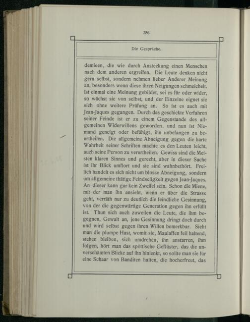 nach dem anderen ergreifen. Die Leute denken nicht gern selbst, sondern nehmen lieber Anderer Meinung an, besonders wenn diese ihren Neigungen schmeichelt. Ist einmal eine Meinung gebildet, sei es für oder wider, so wächst sie von selbst, und der Einzelne eignet sie sich ohne weitere Prüfung an. So ist es auch mit Jean-Jaques gegangen. Durch das geschickte Verfahren seiner Feinde ist er zu einem Gegenstande des allgemeinen Widerwillens geworden, und nun ist Niemand geneigt oder befähigt, ihn unbefangen zu beurtheilen. Die allgemeine Abneigung gegen die harte Wahrheit seiner Schriften machte es den Leuten leicht, auch seine Person zu verurtheilen. Gewiss sind die Meisten klaren Sinnes und gerecht, aber in dieser Sache ist ihr Blick umflort und sie sind wahnbethört. Freilich handelt es sich nicht um blosse Abneigung, sondern um allgemeine thätige Feindseligkeit gegen Jean-Jaques. An dieser kann gar kein Zweifel sein. Schon die Miene, mit der man ihn ansieht, wenn er über die Strasse geht, verräth nur zu deutlich die feindliche Gesinnung, von der die gegenwärtige Generation gegen ihn erfüllt ist. Thun sich auch zuweilen die Leute, die ihm begegnen, Gewalt an, jene Gesinnung dringt doch durch und wird selbst gegen ihren Willen bemerkbar. Sieht man die plumpe Hast, womit sie, Maulaffen feil haltend, stehen bleiben, sich umdrehen, ihn anstarren, ihm folgen, hört man das spöttische Geflüster, das die unverschämten Blicke auf ihn hinlenkt, so sollte man sie für eine Schaar von Banditen halten, die hocherfreut, das