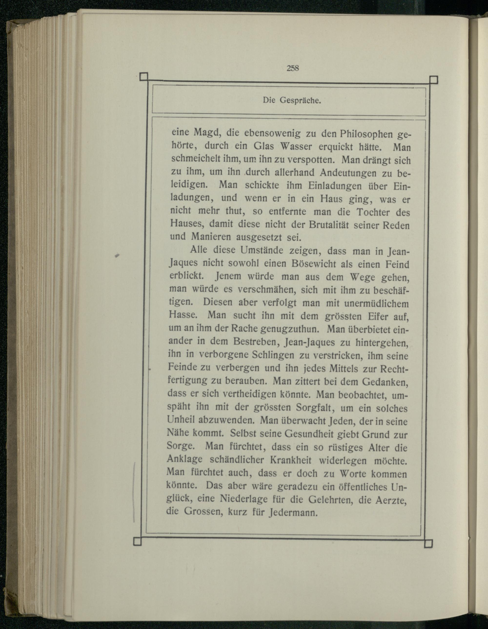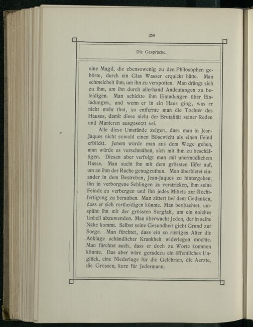 Alle diese Umstände zeigen, dass man in JeanJaques nicht sowohl einen Bösewicht als einen Feind erblickt. Jenem würde man aus dem Wege gehen, man würde es verschmähen, sich mit ihm zu beschäftigen. Diesen aber verfolgt man mit unermüdlichem Hasse. Man sucht ihn mit dem grössten Eifer auf, um an ihm der Rache genugzuthun. Man überbietet einander in dem Bestreben, Jean-Jaques zu hintergehen, ihn in verborgene Schlingen zu verstricken, ihm seine Feinde zu verbergen und ihn jedes Mittels zur RechtFertigung zu berauben. Man zittert bei dem Gedanken, dass er sich vertheidigen könnte. Man beobachtet, umspäht ihn mit der grössten Sorgfalt, um ein solches Unheil abzuwenden. Man überwacht Jeden, der in seine Nähe kommt. Selbst seine Gesundheit giebt Grund zur Sorge. Man fürchtet, dass ein so rüstiges Alter die Anklage schändlicher Krankheit widerlegen möchte. Man fürchtet auch, dass er doch zu Worte kommen könnte. Das aber wäre geradezu ein öffentliches Unglück, eine Niederlage für die Gelehrten, die Aerzte, die Grossen, kurz für Jedermann.