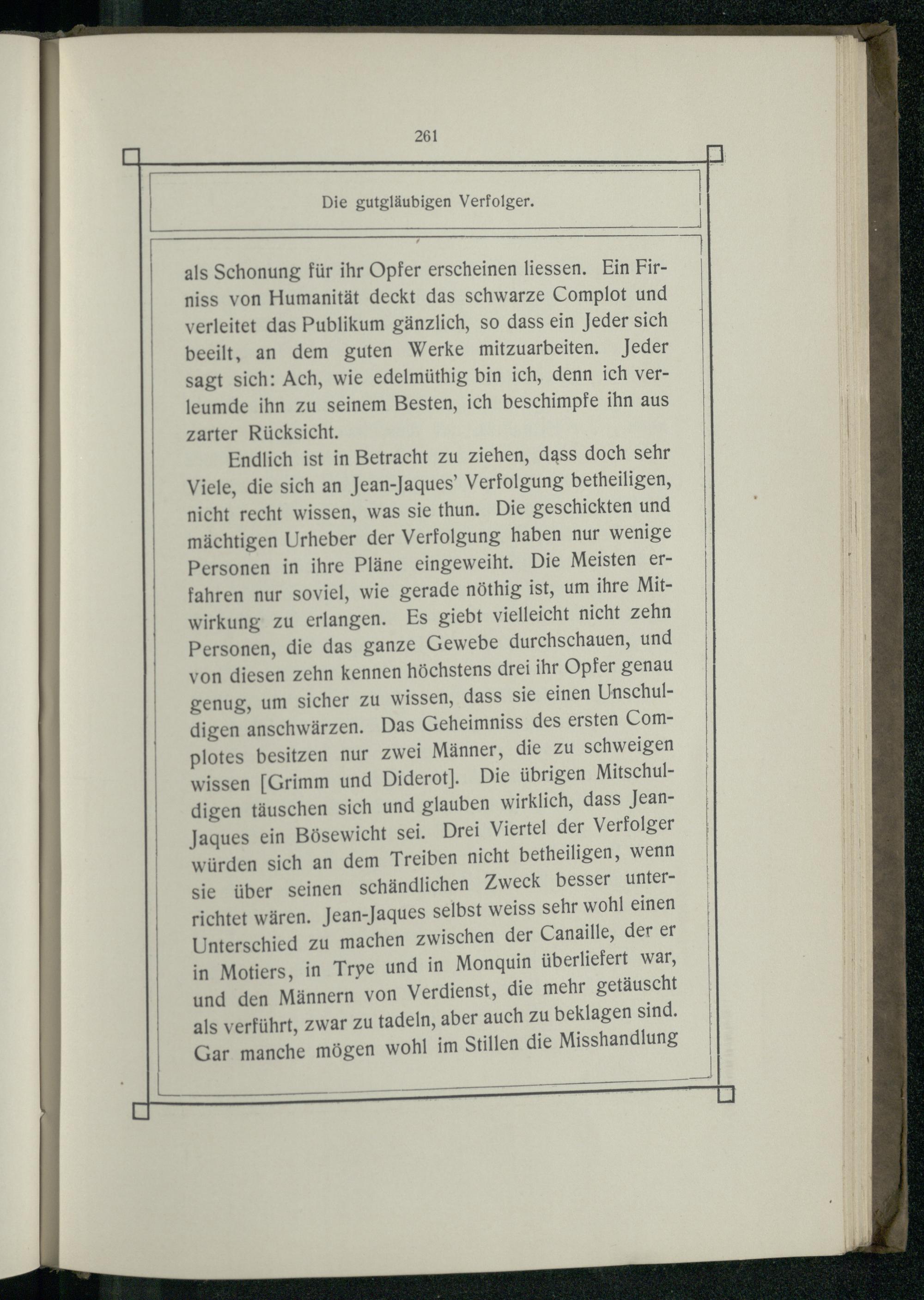 Endlich ist in Betracht zu ziehen, dass doch sehr Viele, die sich an Jean-Jaques’ Verfolgung betheiligen, nicht recht wissen, was sie thun. Die geschickten und mächtigen Urheber der Verfolgung haben nur wenige Personen in ihre Pläne eingeweiht. Die Meisten erfahren nur soviel, wie gerade nöthig ist, um ihre Mitwirkung‘ zu erlangen. Es giebt vielleicht nicht zehn Personen, die das ganze Gewebe durchschauen, und von diesen zehn kennen höchstens drei ihr Opfer genau genug, um sicher zu wissen, dass sie einen Unschuldigen anschwärzen. Das Geheimniss des ersten Complotes besitzen nur zwei Männer, die zu schweigen wissen[Grimm und Diderot]. Die übrigen Mitschuldigen täuschen sich und glauben wirklich, dass JeanJaques ein Bösewicht sei. Drei Viertel der Verfolger würden sich an dem Treiben nicht betheiligen, wenn sie über seinen schändlichen Zweck besser unterrichtet wären. Jean-Jaques selbst weiss sehr wohl einen Unterschied zu machen zwischen der Canaille, der er in Motiers, in Trpye und in Monquin überliefert war, und den Männern von Verdienst, die mehr getäuscht als verführt, zwar zu tadeln, aber auch zu beklagen sind. Gar manche mögen wohl im Stillen die Misshandlung