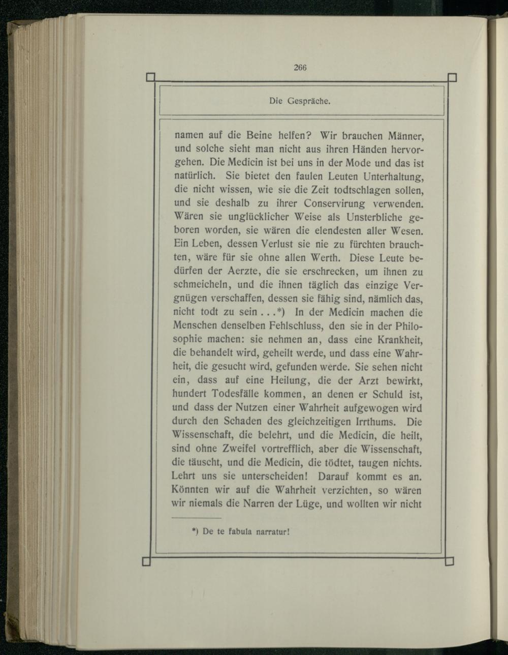 namen auf die Beine helfen? Wir brauchen Männer, und solche sieht man nicht aus ihren Händen hervorgehen. Die Medicin ist bei uns in der Mode und das ist natürlich. Sie bietet den faulen Leuten Unterhaltung, die nicht wissen, wie sie die Zeit todtschlagen sollen, und sie deshalb zu ihrer Conservirung verwenden. Wären sie unglücklicher Weise als Unsterbliche geboren worden, sie wären die elendesten aller Wesen. Ein Leben, dessen Verlust sie nie zu fürchten brauchten, wäre für sie ohne allen Werth. Diese Leute bedürfen der Aerzte, die sie erschrecken, um ihnen zu schmeicheln, und die ihnen täglich das einzige Vergnügen verschaffen, dessen sie fähig sind, nämlich das, nicht todt zu sein...*) In der Medicin machen die Menschen denselben Fehlschluss, den sie in der Philosophie machen: sie nehmen an, dass eine Krankheit, die behandelt wird, geheilt werde, und dass eine Wahrheit, die gesucht wird, gefunden werde. Sie sehen nicht ein, dass auf eine Heilung, die der Arzt bewirkt, hundert Todesfälle kommen, an denen er Schuld ist, und dass der Nutzen einer Wahrheit aufgewogen wird durch den Schaden des gleichzeitigen Irrthums. Die Wissenschaft, die belehrt, und die Medicin, die heilt, sind ohne Zweifel vortrefflich, aber die Wissenschaft, die täuscht, und die Medicin, die tödtet, taugen nichts. Lehrt uns sie unterscheiden! Darauf kommt es an. Könnten wir auf die Wahrheit verzichten, so wären wir niemals die Narren der Lüge, und wollten wir nicht