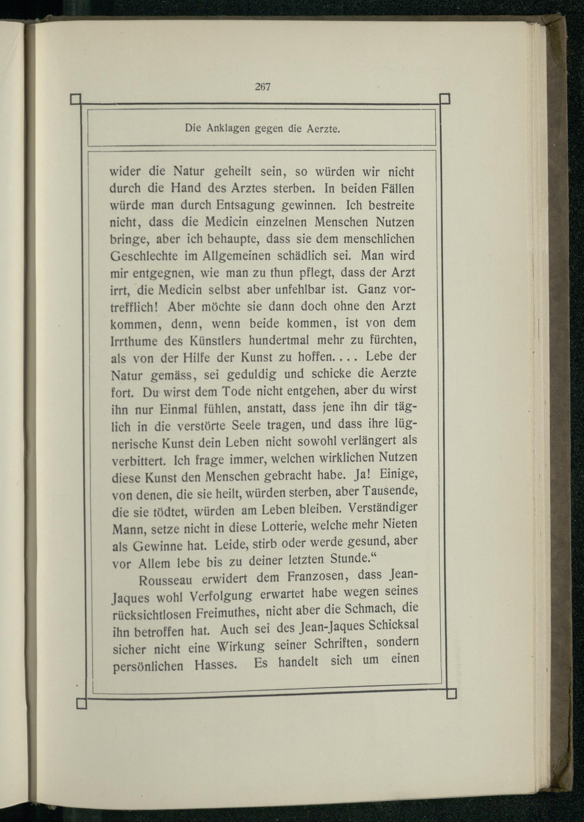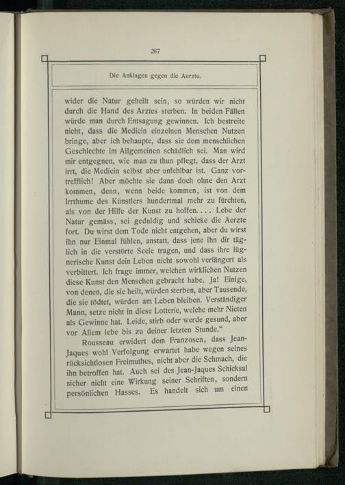 wider die Natur geheilt sein, so würden wir nicht durch die Hand des Arztes sterben. In beiden Fällen würde man durch Entsagung gewinnen. Ich bestreite nicht, dass die Medicin einzelnen Menschen Nutzen bringe, aber ich behaupte, dass sie dem menschlichen Geschlechte im Allgemeinen schädlich sei. Man wird mir entgegnen, wie man zu thun pflegt, dass der Arzt irrt, die Medicin selbst aber unfehlbar ist. Ganz vortrefflich! Aber möchte sie dann doch ohne den Arzt kommen, denn, wenn beide kommen, ist von dem Irrthume des Künstlers hundertmal mehr zu fürchten, als von der Hilfe der Kunst zu hoffen.... Lebe der Natur gemäss, sei geduldig und schicke die Aerzte fort. Du wirst dem Tode nicht entgehen, aber du wirst ihn nur Einmal fühlen, anstatt, dass jene ihn dir täglich in die verstörte Seele tragen, und dass ihre lügnerische Kunst dein Leben nicht sowohl verlängert als verbittert. Ich frage immer, welchen wirklichen Nutzen diese Kunst den Menschen gebracht habe. Ja! Einige, von denen, die sie heilt, würden sterben, aber Tausende, die sie tödtet, würden am Leben bleiben. Verständiger Mann, setze nicht in diese Lotterie, welche mehr Nieten als Gewinne hat. Leide, stirb oder werde gesund, aber vor Allem lebe bis zu deiner letzten Stunde.“ Rousseau erwidert dem Franzosen, dass JeanJaques wohl Verfolgung erwartet habe wegen seines rücksichtlosen Freimuthes, nicht aber die Schmach, die ihn betroffen hat. Auch sei des Jean-Jaques Schicksal sicher nicht eine Wirkung seiner Schriften, sondern persönlichen Hasses. Es handelt sich um einen