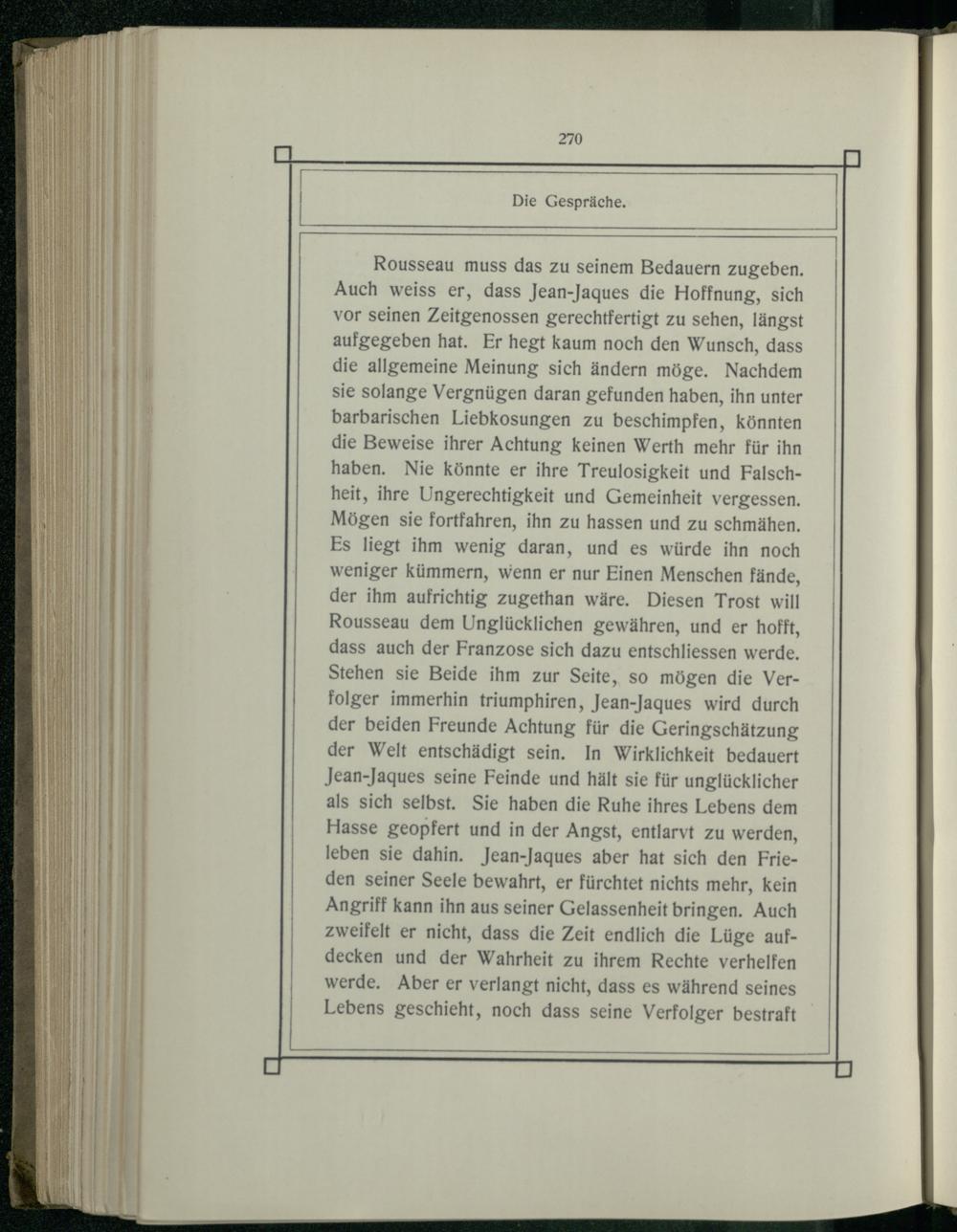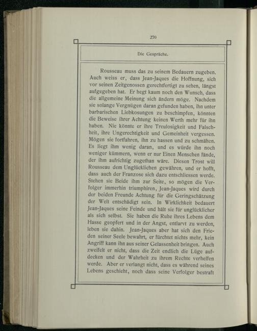 Rousseau muss das zu seinem Bedauern zugeben. Auch weiss er, dass Jean-Jaques die Hoffnung, sich vor seinen Zeitgenossen gerechtfertigt zu sehen, längst aufgegeben hat. Er hegt kaum noch den Wunsch, dass die allgemeine Meinung sich ändern möge. Nachdem sie solange Vergnügen daran gefunden haben, ihn unter barbarischen Liebkosungen zu beschimpfen, könnten die Beweise ihrer Achtung keinen Werth mehr für ihn haben. Nie könnte er ihre Treulosigkeit und Falschheit, ihre Ungerechtigkeit und Gemeinheit vergessen. Mögen sie fortfahren, ihn zu hassen und zu schmähen. Es liegt ihm wenig daran, und es würde ihn noch weniger kümmern, wenn er nur Einen Menschen fände, der ihm aufrichtig zugethan wäre. Diesen Trost will Rousseau dem Unglücklichen gewähren, und er hofft, dass auch der Franzose sich dazu entschliessen werde. Stehen sie Beide ihm zur Seite, so mögen die Verfolger immerhin triumphiren, Jean-Jaques wird durch der beiden Freunde Achtung für die Geringschätzung der Welt entschädigt sein. In Wirklichkeit bedauert Jean-Jaques seine Feinde und hält sie für unglücklicher als sich selbst. Sie haben die Ruhe ihres Lebens dem Hasse geopfert und in der Angst, entlarvt zu werden, leben sie dahin. Jean-Jaques aber hat sich den Frieden seiner Seele bewahrt, er fürchtet nichts mehr, kein Angriff kann ihn aus seiner Gelassenheit bringen. Auch zweifelt er nicht, dass die Zeit endlich die Lüge aufdecken und der Wahrheit zu ihrem Rechte verhelfen werde, Aber er verlangt nicht, dass es während seines Lebens geschieht, noch dass seine Verfolger bestraft