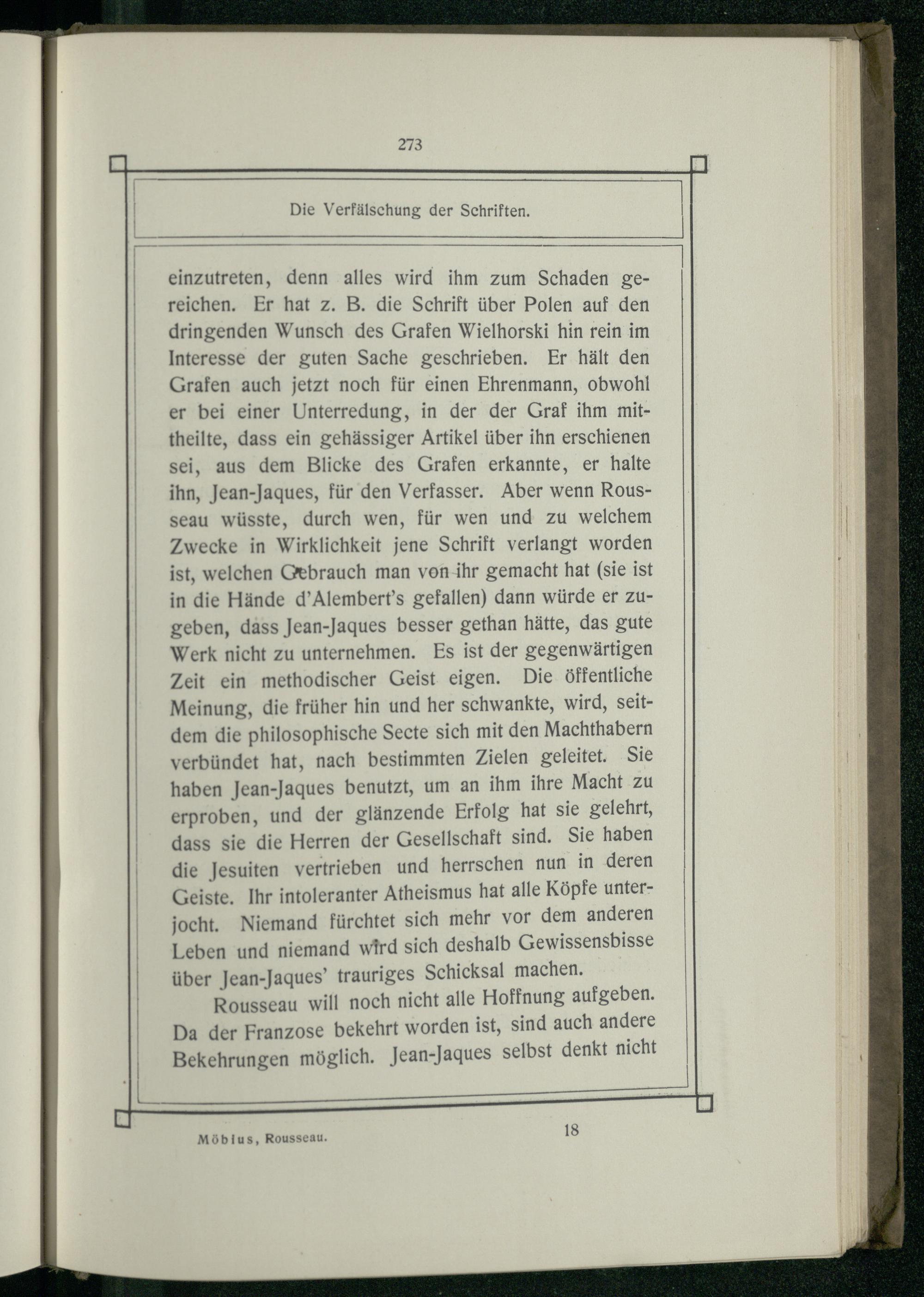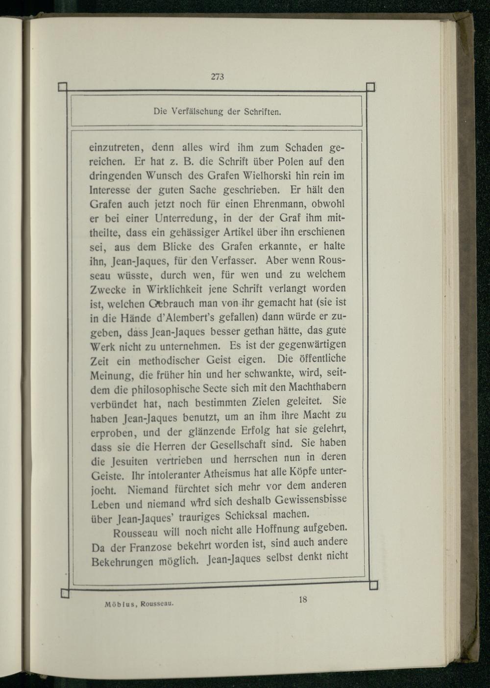 einzutreten, denn alles wird ihm zum Schaden gereichen. Er hat z. B. die Schrift über Polen auf. den dringenden Wunsch des Grafen Wielhorski hin rein im Interesse der guten Sache geschrieben. Er hält den Grafen auch jetzt noch für einen Ehrenmann, obwohl er bei einer Unterredung, in der der Graf ihm mittheilte, dass ein gehässiger Artikel über ihn erschienen sei, aus dem Blicke des Grafen erkannte, er halte ihn, Jean-Jaques, für den Verfasser. Aber wenn Rousseau wüsste, durch wen, für wen und zu welchem Zwecke in Wirklichkeit jene Schrift verlangt worden ist, welchen Gebrauch man von-ihr gemacht hat(sie ist in die Hände d’Alembert’s gefallen) dann würde er zugeben, dass Jean-Jaques besser gethan hätte, das gute Werk nicht zu unternehmen. Es ist der gegenwärtigen Zeit ein methodischer Geist. eigen. Die öffentliche Meinung, die früher hin und her schwankte, wird, Seitdem die philosophische Secte sich mit den Machthabern verbündet hat, nach bestimmten Zielen geleitet. Sie haben Jean-Jaques benutzt, um an ihm ihre Macht zu erproben, und der glänzende Erfolg hat sie gelehrt, dass sie die Herren der Gesellschaft sind. Sie haben die Jesuiten vertrieben und herrschen nun in deren Geiste. Ihr intoleranter Atheismus hat alle Köpfe unterjocht. Niemand fürchtet sich mehr vor dem anderen Leben und niemand wird sich deshalb Gewissensbisse über Jean-Jaques’ trauriges Schicksal machen. Rousseau will noch nicht alle Hoffnung aufgeben. Da der Franzose bekehrt worden ist, sind auch andere Bekehrungen möglich. Jean-Jaques selbst denkt nicht