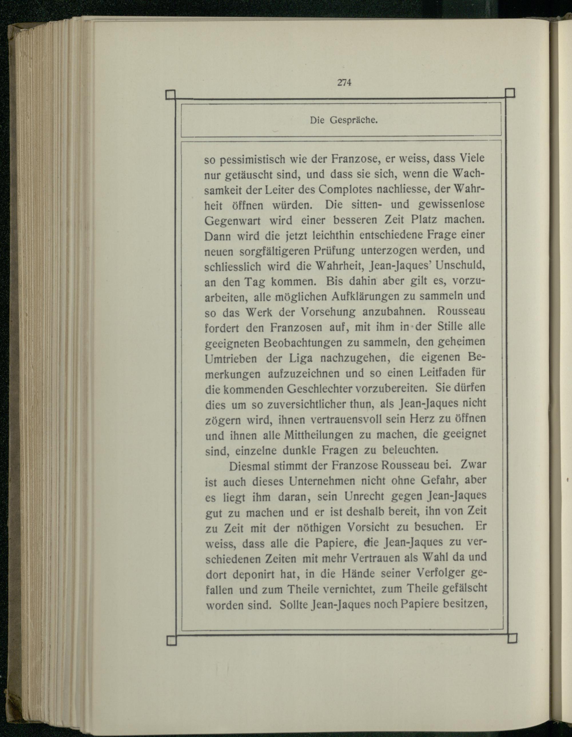 so pessimistisch wie der Franzose, er weiss, dass Viele nur getäuscht sind, und dass sie sich, wenn die Wachsamkeit der Leiter des Complotes nachliesse, der Wahrheit öffnen würden. Die sitten- und gewissenlose Gegenwart wird einer besseren Zeit Platz machen. Dann wird die jetzt leichthin entschiedene Frage einer neuen sorgfältigeren Prüfung unterzogen werden, und schliesslich wird die Wahrheit, Jean-Jaques’ Unschuld, an den Tag kommen. Bis dahin aber gilt es, vorzuarbeiten, alle möglichen Aufklärungen zu sammeln und so das Werk der Vorsehung anzubahnen. Rousseau fordert den Franzosen auf, mit ihm in-der Stille alle geeigneten Beobachtungen zu sammeln, den geheimen Umtrieben der Liga nachzugehen, die eigenen Bemerkungen aufzuzeichnen und so einen Leitfaden für die kommenden Geschlechter vorzubereiten. Sie dürfen dies um so zuversichtlicher thun, als Jean-Jaques nicht zögern wird, ihnen vertrauensvoll sein Herz zu öffnen und ihnen alle Mittheilungen zu machen, die geeignet sind, einzelne dunkle Fragen zu beleuchten.