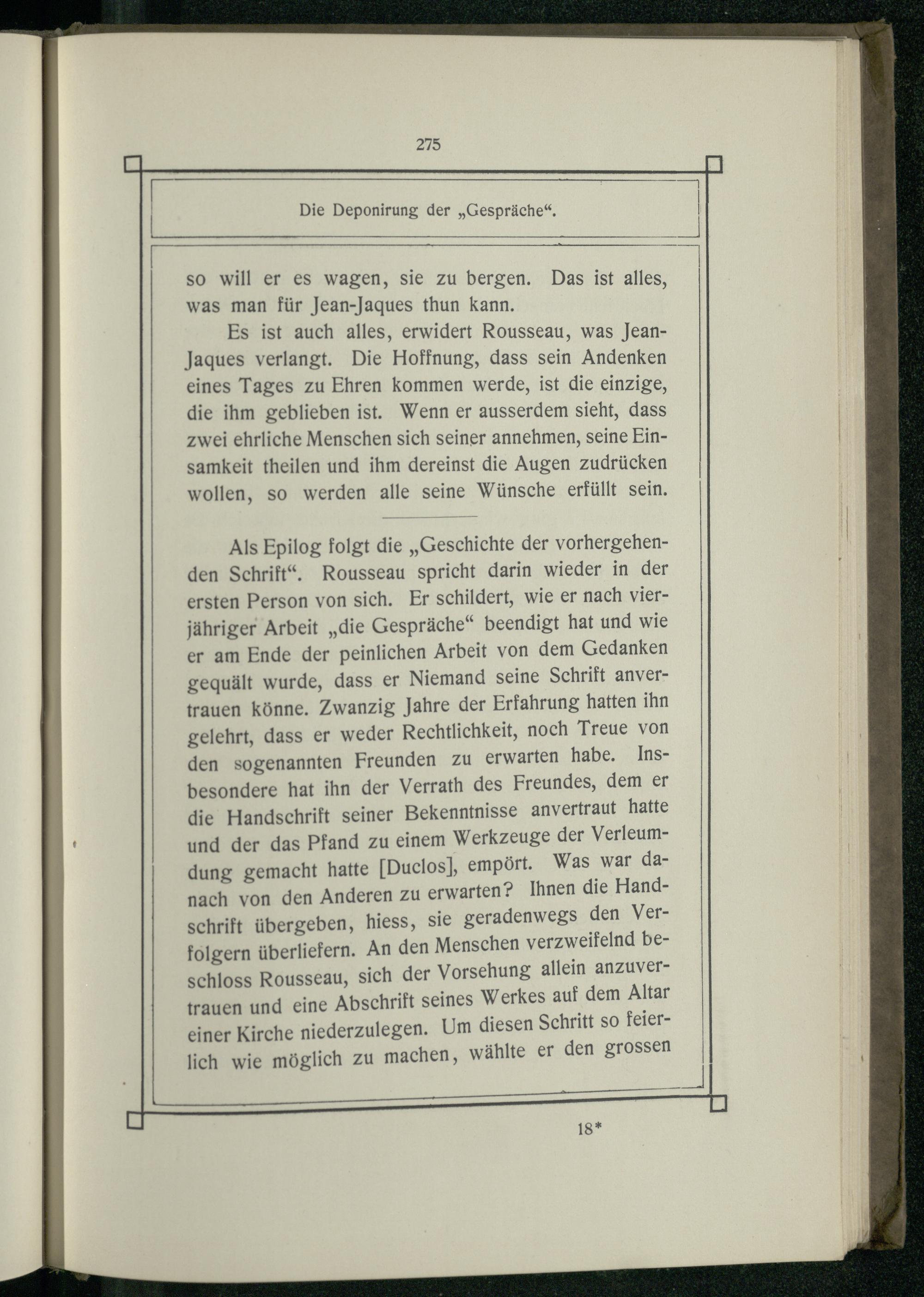 Als Epilog folgt die„Geschichte der vorhergehenden Schrift“. Rousseau spricht darin wieder in der ersten Person von sich. Er schildert, wie er nach vierjähriger Arbeit„die Gespräche“ beendigt hat und wie er am Ende der peinlichen Arbeit von dem Gedanken gequält wurde, dass er Niemand seine Schrift anvertrauen könne. Zwanzig Jahre der Erfahrung hatten ihn gelehrt, dass er weder Rechtlichkeit, noch Treue von den sogenannten Freunden zu erwarten habe. Insbesondere hat ihn der Verrath des Freundes, dem er die Handschrift seiner Bekenntnisse anvertraut hatte und der das Pfand zu einem Werkzeuge der Verleumdung gemacht hatte[Duclos], empört. Was war danach von den Anderen zu erwarten? Ihnen die Handschrift übergeben, hiess, sie geradenwegs den Verfolgern überliefern. An den Menschen verzweifelnd beschloss Rousseau, sich der Vorsehung allein anzuvertrauen und eine Abschrift seines Werkes auf dem Altar einer Kirche niederzulegen. Um diesen Schritt so feierlich wie möglich zu machen, wählte er den grossen