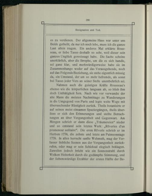 Nahmen auch die geistigen Kräfte Rousseau’s ebenso wie die körperlichen langsam ab, so blieb ihm doch Unthätigkeit fern. Nach wie vor verwandte der alte Mann die meisten Nachmittage zu Wanderungen in die Umgegend von Paris und legte weite Wege mit überraschender Rüstigkeit zurück. Theils botanisirte er auf seinen meist einsamen Spaziergängen, theils überliess er sich den Erinnerungen und stellte Betrachtungen an über Vergangenheit und Gegenwart. Am Morgen schrieb er dann diese„Träumereien“ nieder und so entstand sein letztes Werk:„R&veries d’un promeneur solitaire“. Die erste Reverie schrieb er im Herbste 1776, die zehnte und letzte am Palmsonntage 1778. In allen herrscht sanfte Wehmuth, mag der Verfasser liebliche Scenen aus der Vergangenheit zurückrufen, oder mag er sein Schicksal elegisch beklagen. Zuweilen jedoch bricht wie ein Sonnenstrahl durch Wolken Heiterkeit durch die gedämpfte Stimmung, und der liebenswürdige Erzähler der ersten Hälfte der Be