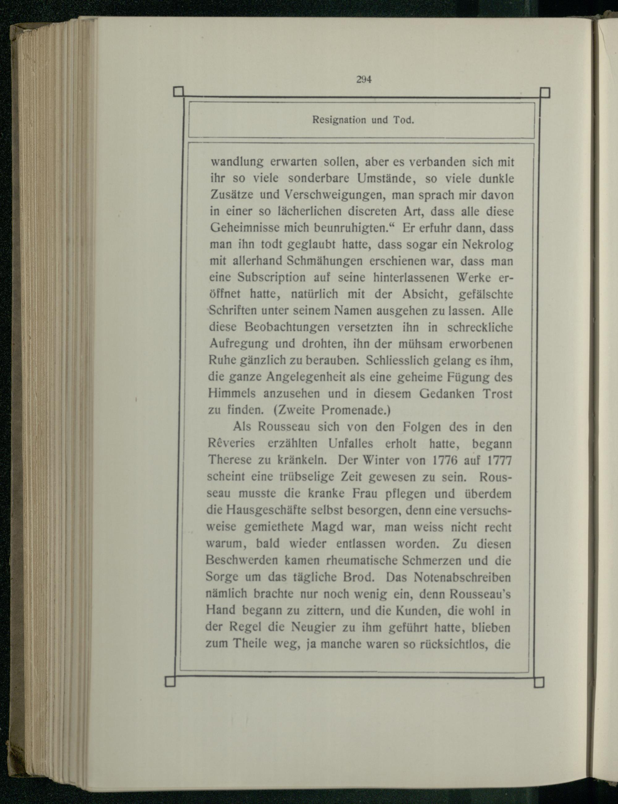 wandlung erwarten sollen, aber es verbanden sich mit ihr so viele sonderbare Umstände, so viele dunkle Zusätze und Verschweigungen, man sprach mir davon in einer so lächerlichen discreten Art, dass alle diese Geheimnisse mich beunruhigten.“ Er erfuhr dann, dass man ihn todt geglaubt hatte, dass sogar ein Nekrolog mit allerhand Schmähungen erschienen war, dass man eine Subscription auf seine hinterlassenen Werke eröffnet hatte, natürlich mit der Absicht, gefälschte Schriften unter seinem Namen ausgehen zu lassen. Alle diese Beobachtungen versetzten ihn in schreckliche Aufregung und drohten, ihn der mühsam erworbenen Ruhe gänzlich zu berauben. Schliesslich gelang es ihm, die ganze Angelegenheit als eine geheime Fügung des Himmels anzusehen und in diesem Gedanken Trost zu finden.(Zweite Promenade.)