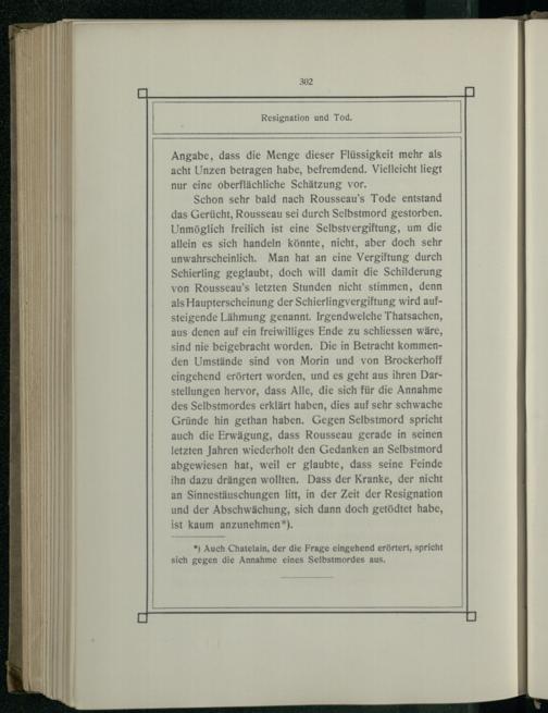 Schon sehr bald nach Rousseau’s Tode entstand das Gerücht, Rousseau sei durch Selbstmord gestorben. Unmöglich freilich ist eine Selbstvergiftung, um die allein es sich handeln könnte, nicht, aber doch sehr unwahrscheinlich. Man hat an eine Vergiftung durch Schierling geglaubt, doch will damit die Schilderung von Rousseau’s letzten Stunden nicht stimmen, denn als Haupterscheinung der Schierlingvergiftung wird aufsteigende Lähmung genannt. Irgendwelche Thatsachen, aus denen auf ein freiwilliges Ende zu schliessen wäre, sind nie beigebracht worden. Die in Betracht kommenden Umstände sind von Morin und von Brockerhoff eingehend erörtert worden, und es geht aus ihren Darstellungen hervor, dass Alle, die sich für die Annahme des Selbstmordes erklärt haben, dies auf sehr schwache Gründe hin gethan haben. Gegen Selbstmord spricht auch die Erwägung, dass Rousseau gerade in seinen letzten Jahren wiederholt den Gedanken an Selbstmord abgewiesen hat, weil er glaubte, dass seine Feinde ihn dazu drängen wollten. Dass der Kranke, der nicht an Sinnestäuschungen litt, in der Zeit der Resignation und der Abschwächung, sich dann doch getödtet habe, ist kaum anzunehmen*).