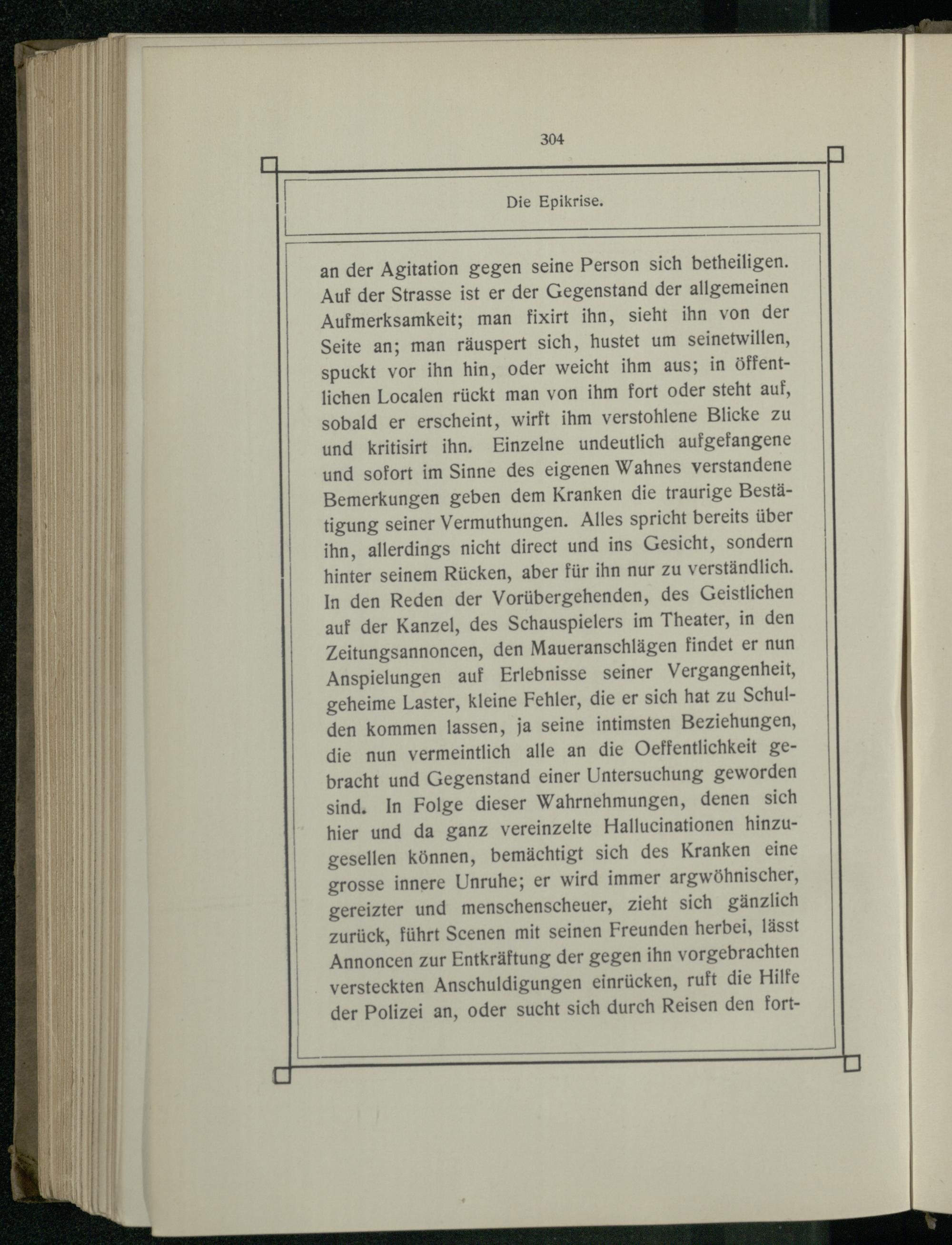 an der Agitation gegen seine Person sich betheiligen. Auf der Strasse ist er der Gegenstand der allgemeinen Aufmerksamkeit; man fixirt ihn, sieht ihn von der Seite an; man räuspert sich, hustet um seinetwillen, spuckt vor ihn hin, oder weicht ihm aus; in Ööffentlichen Localen rückt man von ihm fort oder steht auf, sobald er erscheint, wirft ihm verstohlene Blicke zu und Kritisirt ihn. Einzelne undeutlich aufgefangene und sofort im Sinne des eigenen Wahnes verstandene Bemerkungen geben dem Kranken die traurige Bestätigung seiner Vermuthungen. Alles spricht bereits über ihn, allerdings nicht direct und ins Gesicht, sondern hinter seinem Rücken, aber für ihn nur zu verständlich. In den Reden der Vorübergehenden, des Geistlichen auf der Kanzel, des Schauspielers im Theater, in den Zeitungsannoncen, den Maueranschlägen findet er nun Anspielungen auf Erlebnisse seiner Vergangenheit, geheime Laster, kleine Fehler, die er sich hat zu Schulden kommen lassen, ja seine intimsten Beziehungen, die nun vermeintlich alle an die Oeffentlichkeit gebracht und Gegenstand einer Untersuchung geworden sind. In Folge dieser Wahrnehmungen, denen sich hier und da ganz vereinzelte Hallucinationen hinzugesellen können, bemächtigt sich des Kranken eine grosse innere Unruhe; er wird immer argwöhnischer, gereizter und menschenscheuer, zieht sich gänzlich zurück, führt Scenen mit seinen Freunden herbei, lässt Annoncen zur Entkräftung der gegen ihn vorgebrachten versteckten Anschuldigungen einrücken, ruft die Hilfe der Polizei an, oder sucht sich durch Reisen den fort