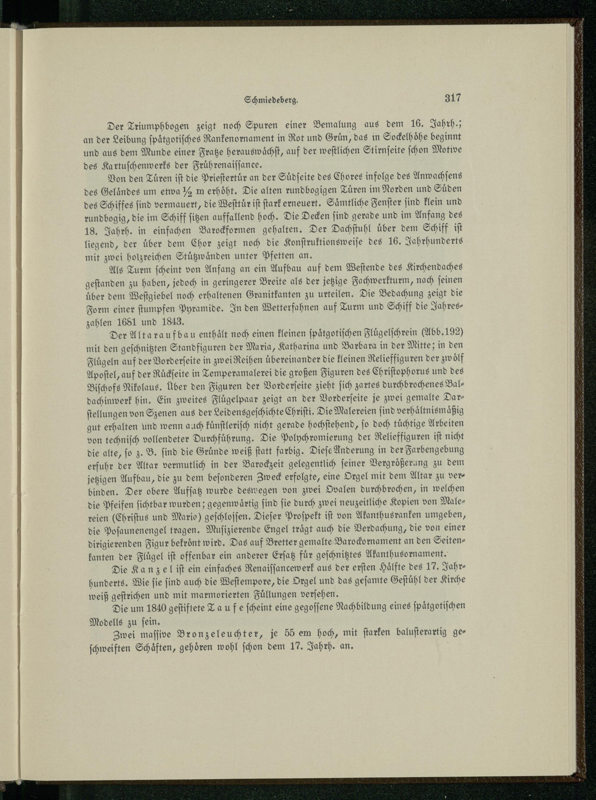 Der Alta rauf bau enthält noch einen kleinen ſpaͤtgotiſchen Flüuͤgelſchrein(Abb. 192) mit den geſchnitzten Standfiguren der Maria, Katharina und Barbara in der Mitte; in den Flügeln auf der Vorderſeite in zwei Reihen übereinander die kleinen Relieffiguren der zwoͤlf Apoſtel, auf der Ruͤckſeite in Temperamalerei die großen Figuren des Chriſtophorus und des Biſchofs Nikolaus. Über den Figuren der Vorderſeite zieht ſich zartes durchbrochenes Baldachinwerk hin. Ein zweites Fluͤgelpaar zeigt an der Vorderſeite je zwei gemalte Darſtellungen von Szenen aus der Leidensgeſchichte Chriſti . Die Malereien ſind verhaͤltnismaͤßig gut erhalten und wenn auch kuͤnſtleriſch nicht gerade hochſtehend, ſo doch tuͤchtige Arbeiten von techniſch vollendeter Durchfuͤhrung. Die Polychromierung der Relieffiguren iſt nicht die alte, ſo z. B. ſind die Gruͤnde weiß ſtatt farbig. Dieſe Anderung in der Farbengebung erfuhr der Altar vermutlich in der Barocheit gelegentlich ſeiner Vergroͤßerung zu dem jetzigen Aufbau, die zu dem beſonderen Zweck erfolgte, eine Orgel mit dem Altar zu ver binden. Der obere Aufſatz wurde deswegen von zwei Ovalen durchbrochen, in welchen die Pfeifen ſichtbar wurden; gegenwaͤrtig ſind ſie durch zwei neuzeitliche Kopien von Malereien(Chriſtus und Mario) geſchloſſen. Dieſer Proſpekt iſt von Akanthusranken umgeben, die Poſaunenengel tragen. Muſizierende Engel traͤgt auch die Verdachung, die von einer dirigie renden Figur bekroͤnt wird. Das auf Bretter gemalte Baroclornament an den Seitenkanten der Fluͤgel iſt offenbar ein anderer Erſatz für geſchnitztes Akanthusornament.