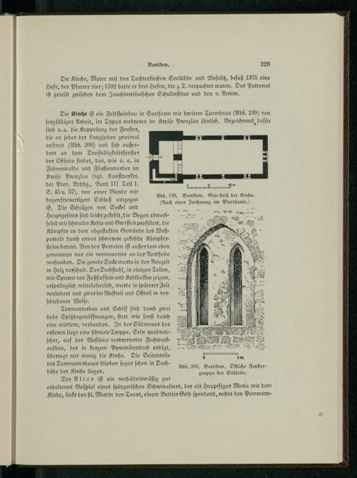 Die Kirche iſt ein Feldſteinbau in Saalform mit breitem Turmhaus(Abb. 199) von ſorgfaͤltiger Arbeit, im Typus mehreren im Kreiſe Prenzlau ähnlich. Bezeichnend dafůr find u. a. die Kuppelung der Fenſter, die an jeder der Langſeiten zweimal auftritt(Abb. 200) und ſich außerdem an dem Deeifaltigkeitsfenſter der Oſtſeite findet, das, wie u. a. in Fahrenwalde und Fuͤrſtenwerder im . Kreiſe Prenzlau (ogl. Kunſtdenkm. 4 der Prov. Brdbg., Band III Teil 1. S. 45 u. 57), von einer Blende mit bogenfriesartigem Schluß umzogen iſt. Die Schraͤgen von Sockel und. Hauptgeſims find leicht gekehlt, die Bogen abwech⸗—— ſelnd mit ſchmaler Kehle und Grotſtab profiliert, die Kämpfer an dem abgeſtuften Gewaͤnde des Weftportals durch etwas ſchwerere gekehlte Kaͤmpferſteine betont. Von den Portalen iſt außer dem eben genannten nur ein vermauertes an der Nordſeite vorhanden. Die gerade Decke wurde in der Neuzeit in Holz verſchalt. Der Dachſtuhl, in einigen Teilen, wie Spuren von Fußſtaffeln und Kehlbalken zeigen, urſpruͤnglich mittelalterlich, wurde in ſpaͤterer Zeit verändert und zwar im Weſtteil und Oſtteil in verſchiedener Weiſe.