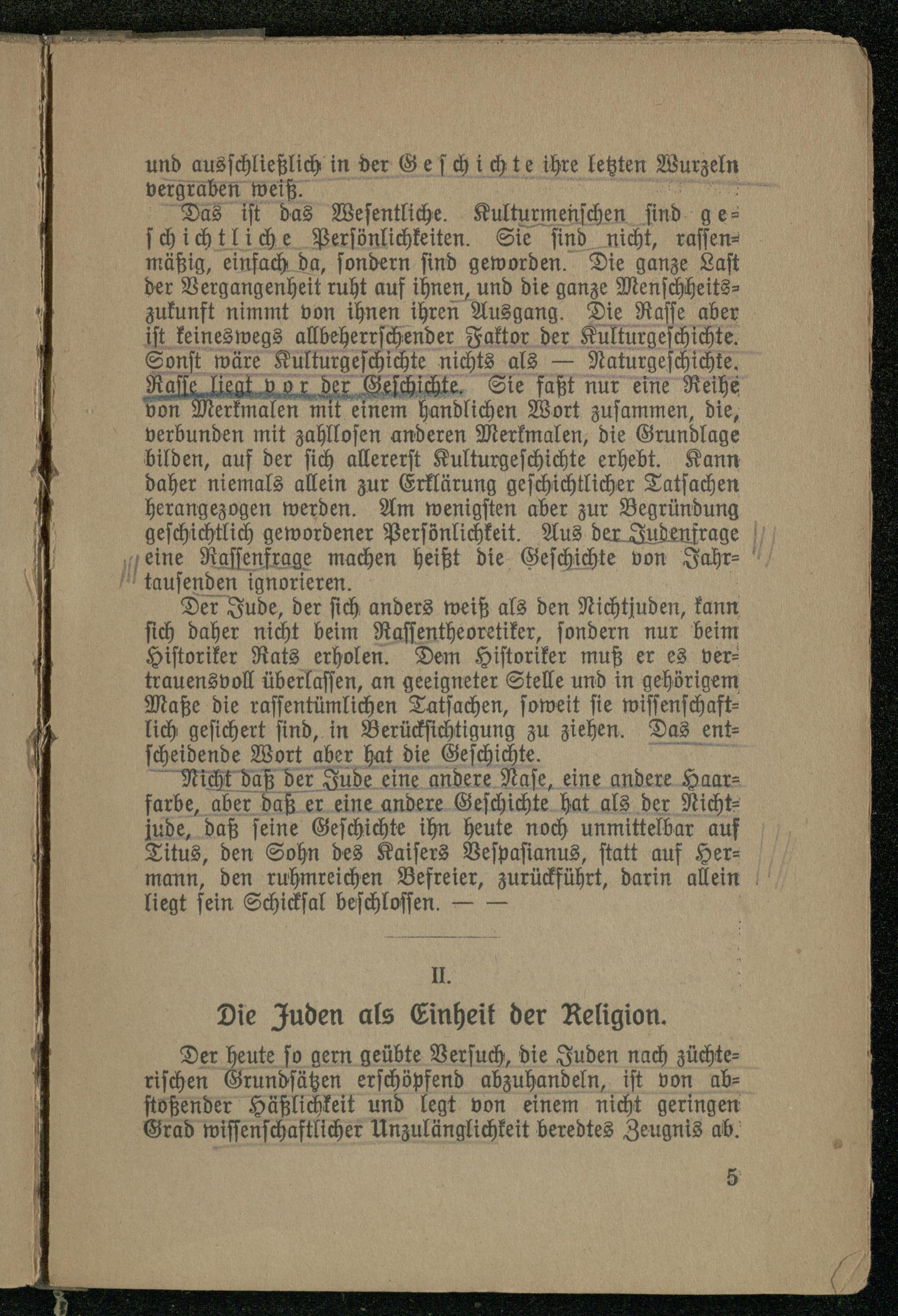 Rasse liegt vor der Geschichte. Sie faßt nur eine Reihe von Merkmalen mit einem handlichen Wort zusammen, die, verbunden mit zahllosen anderen Merkmalen, die Grundlage bilden, auf der sich allererst Kulturgeschichte erhebt. Kann daher niemals allein zur Erklärung geschichtlicher Tatsachen herangezogen werden. Am wenigsten aber zur Begründung geschichtlich gewordener Persönlichkeit. Aus de r Judenfr age eine Rassenfrage machen heißt die Geschichte von Jahrtausenden ignorieren.