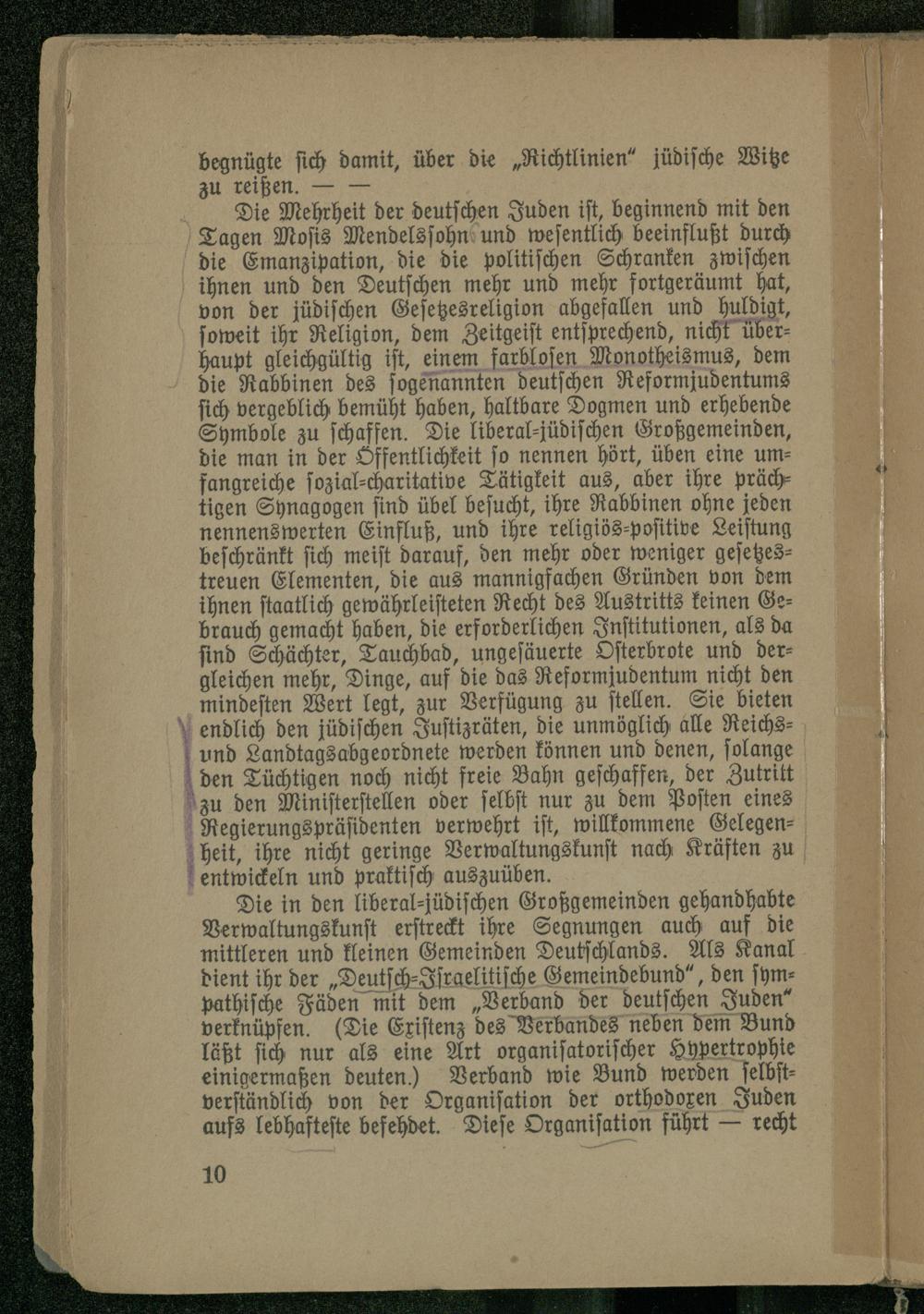 Die Mehrheit der deutschen Juden ist, beginnend mit den Tagen Mosis Mendelssohn und wesentlich beeinflußt durch die Emanzipation, die die politischen Schranken zwischen ihnen und den Deutschen mehr und mehr sortgeräumt hat, von der jüdischen Gesetzesreligion abgefallen und huldigt, soweit ihr Religion, dem Zeitgeist entsprechend, nicht über- haupt gleichgültig ist, einem farblosen Monotheismus, dem die Rabbinen des sogenannten deutschen Reformjudentums sich vergeblich bemüht haben, haltbare Dogmen und erhebende Symbole zu schaffen. Die liberal-jüdischen Großgemeinden, die man in der Öffentlichkeit so nennen hört, üben eine umfangreiche sozial-charitative Tätigkeit aus, aber ihre prächtigen Synagogen sind übel besucht, ihre Rabbinen ohne jeden nennenswerten Einfluß, und ihre religiös-positive Leistung beschränkt sich meist darauf, den mehr oder weniger gesetzestreuen Elementen, die aus mannigfachen Gründen von dem ihnen staatlich gewährleisteten Recht des Austritts keinen Gebrauch gemacht haben, die erforderlichen Institutionen, als da sind Schächter, Tauchbad, ungesäuerte Osterbrote und dergleichen mehr, Dinge, auf die das Reformjudentum nicht den mindesten Wert legt, zur Verfügung zu stellen. Sie bieten endlich den jüdischen Justizräten, die unmöglich alle Reichs- und Landtagsabgeordnete werden können und denen, solange den Tüchtigen noch nicht freie Bahn geschaffen, der Zutritt zu den Ministerstellen oder selbst nur zu dem Posten eines Regierungspräsidenten verwehrt ist, willkommene Gelegen- heit, ihre nicht geringe Verwaltungskunst nach Kräften zu entwickeln und praktisch auszuüben.