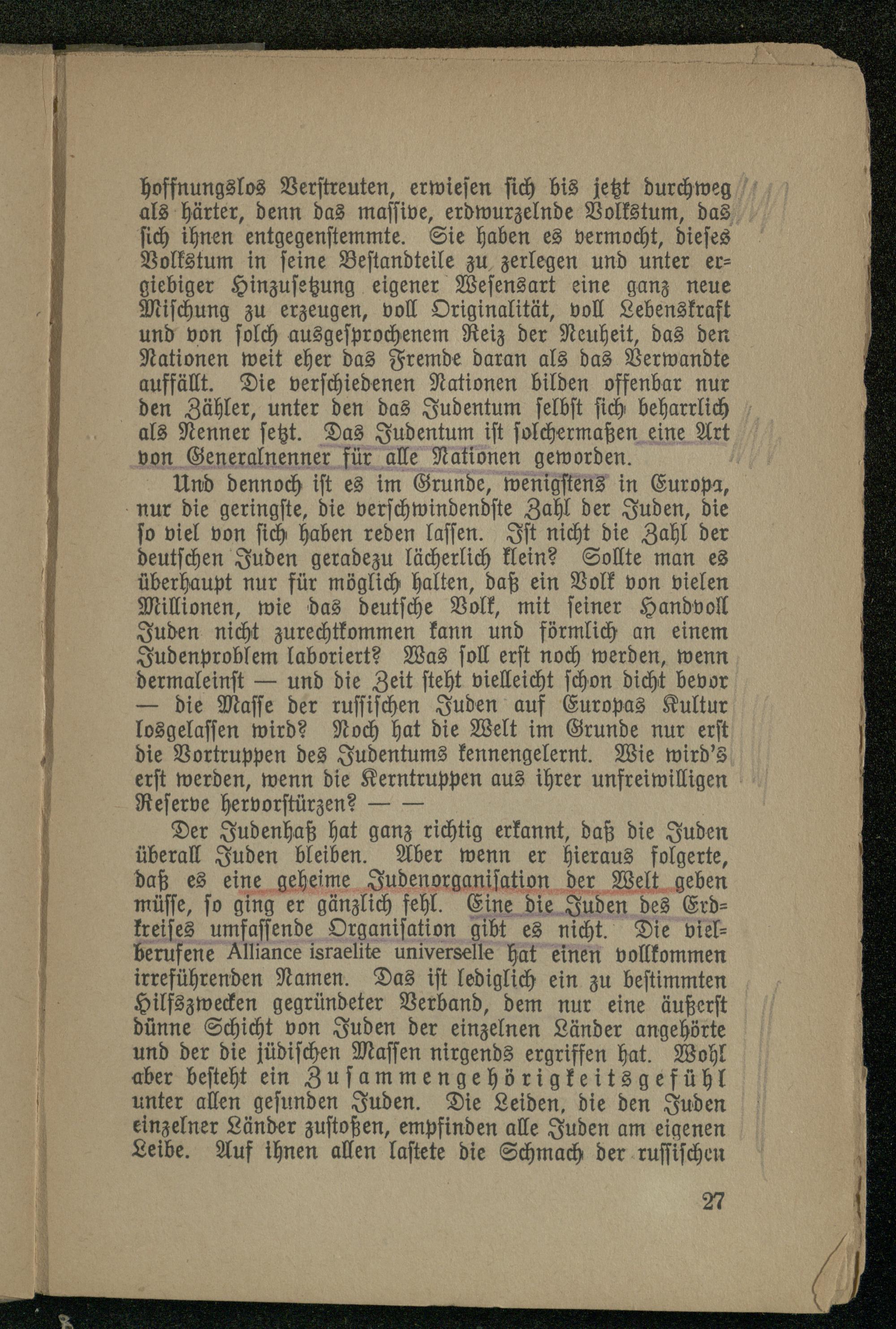 Der Judenhaß hat ganz richtig erkannt, daß die Juden überall Juden bleiben. Aber wenn er hieraus folgerte, daß es eine geheime Judenorganisation der Welt geben müsse, so ging er gänzlich fehl. Eine die Juden des Erdkreises umfassende Organisation gibt es nicht. Die viel- berufene Alliance israelite universelle hat einen vollkommen irreführenden Namen. Das ist lediglich ein zu bestimmten Hilfszwecken gegründeter Verband, dem nur eine äußerst dünne Schicht von Juden der einzelnen Länder angehörte und der die jüdischen Massen nirgends ergriffen hat. Wohl aber besteht ein Zusammengehörigkeitsgefühl unter allen gesunden Juden. Die Leiden, die den Juden einzelner Länder zustoßen, empfinden alle Juden am eigenen Leibe. Auf ihnen allen lastete die Schmach der russischen