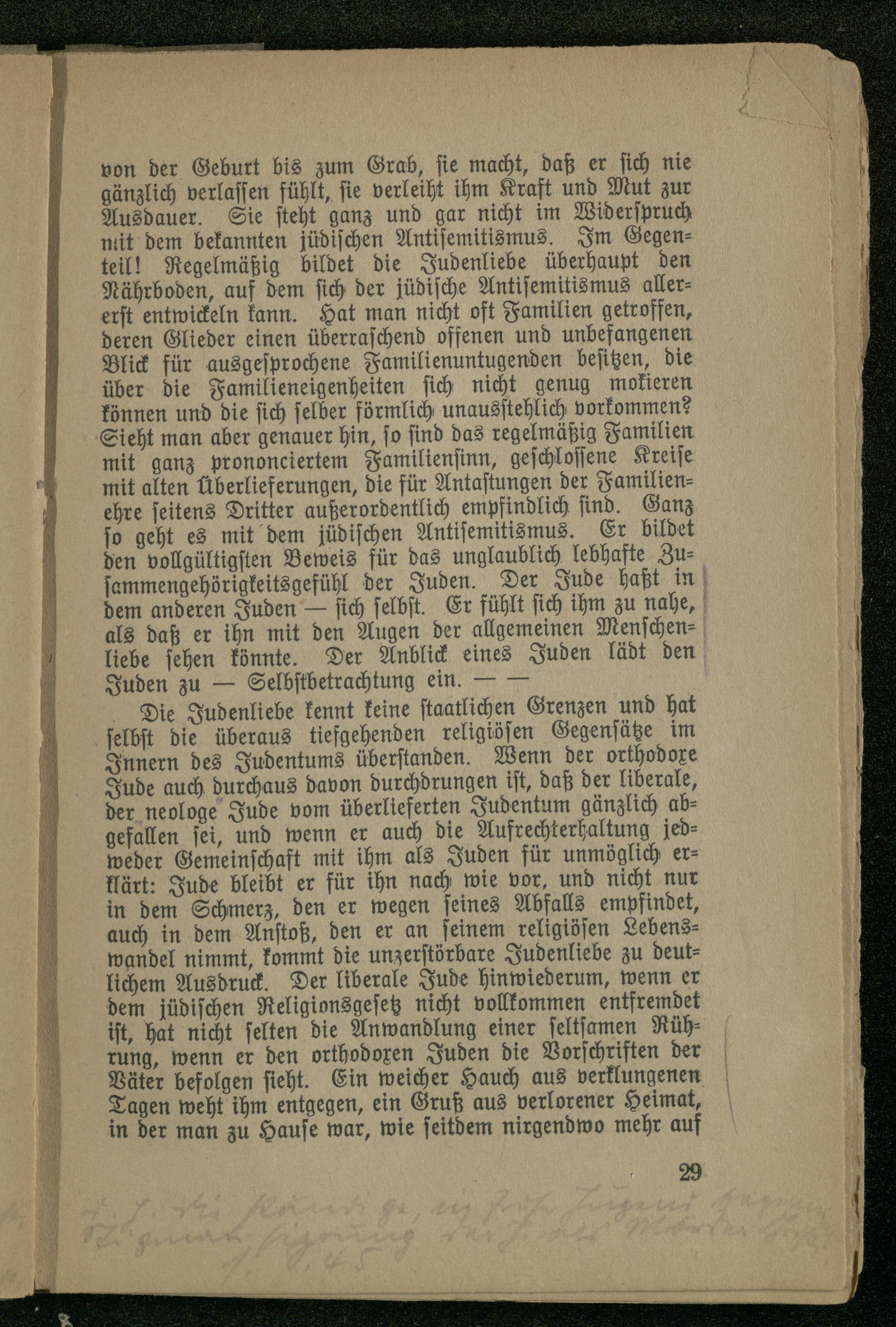 Die Judenliebe kennt keine staatlichen Grenzen und hat selbst die überaus tiefgehenden religiösen Gegensätze im Innern des Judentums überstanden. Wenn der orthodoxe Jude auch durchaus davon durchdrungen ist, daß der liberale, der neologe Jude vom überlieferten Judentum gänzlich abgefallen sei, und wenn er auch die Aufrechterhaltung jedweder Gemeinschaft mit ihm als Juden für unmöglich erklärt: Jude bleibt er für ihn nach wie vor. und nicht nur in dem Schmerz, den er wegen seines Abfalls empfindet, auch in dem Anstoß, den er an seinem religiösen Lebenswandel nimmt, kommt die unzerstörbare Judenliebe zu deutlichem Ausdruck. Der liberale Jude hinwiederum, wenn er dem jüdischen Religionsgesetz nicht vollkommen entfremdet ist, hat nicht selten die Anwandlung einer seltsamen Rührung, wenn er den orthodoxen Juden die Vorschriften der Väter befolgen sieht. Ein weicher Hauch aus verklungenen Tagen weht ihm entgegen, ein Gruß aus verlorener Heimat, in der man zu Hause war, wie seitdem nirgendwo mehr auf