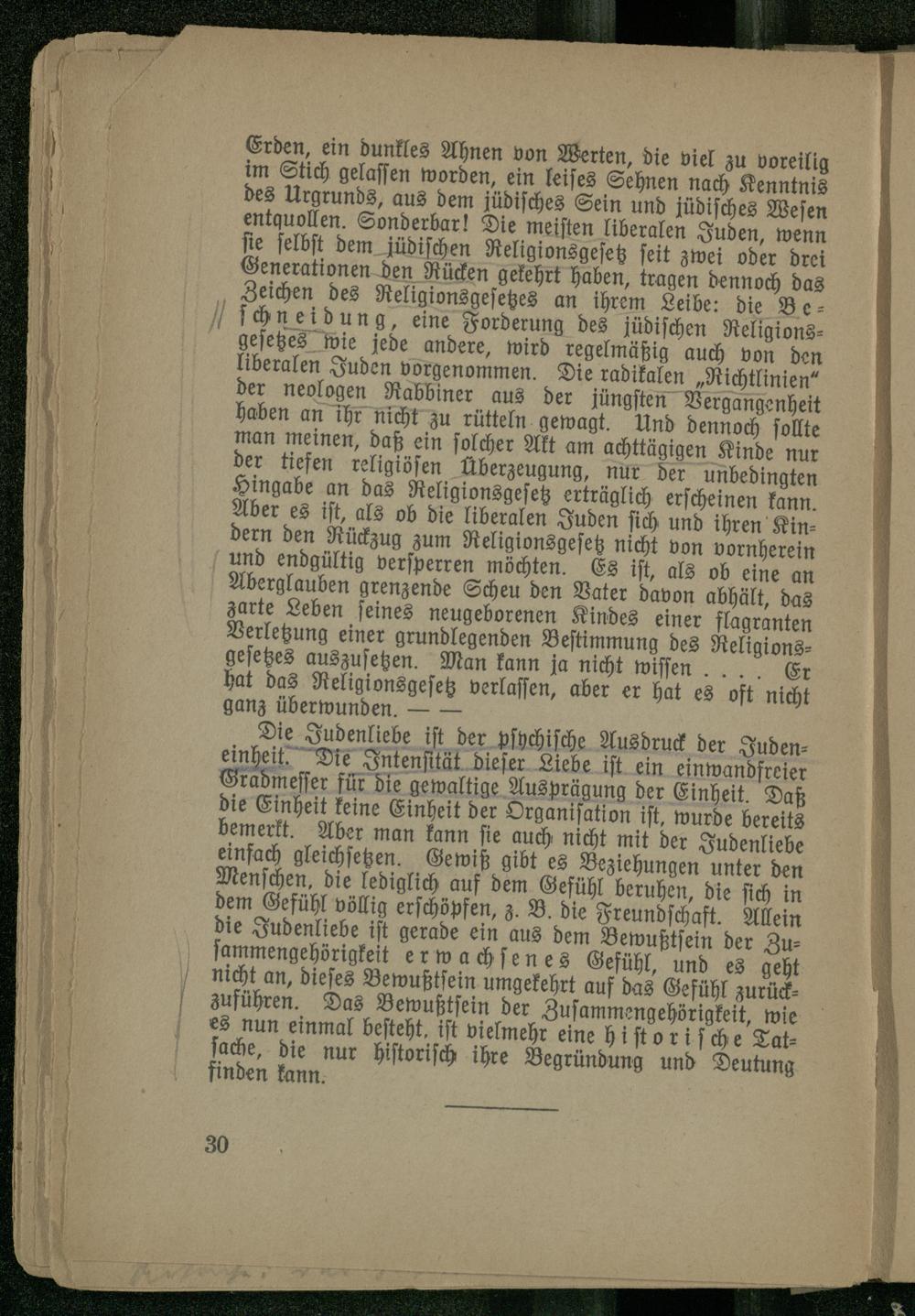 Die Judenliebe ist der psychische Ausdruck der Judeneinheit. Die Intensität dieser Liebe ist ein einwandfreier Gradmesser für die gewaltige Ausprägung der Einheit. Daß die Einheit keine Einheit der Organisation ist. wurde bereits bemerkt. Aber man kann sie auch nicht mit der Judenliebe einfach gleichsetzen. Gewiß gibt es Beziehungen unter den Menschen, die lediglich auf dem Gefühl beruhen, die sich in dem Gefühl völlig erschöpfen, z. B. die Freundschaft. Allein die Judenliebe ist gerade ein aus dem Bewußtsein der Zusammengehörigkeit erwachsenes Gefühl, und es geht nicht an, dieses Bewußtsein umgekehrt auf das Gefühl zurückzuführen. Das Bewußtsein der Zusammengehörigkeit, wie es nun einmal besteht, ist vielmehr eine historische Tatsache, die nur historisch ihre Begründung und Deutung finden kann.