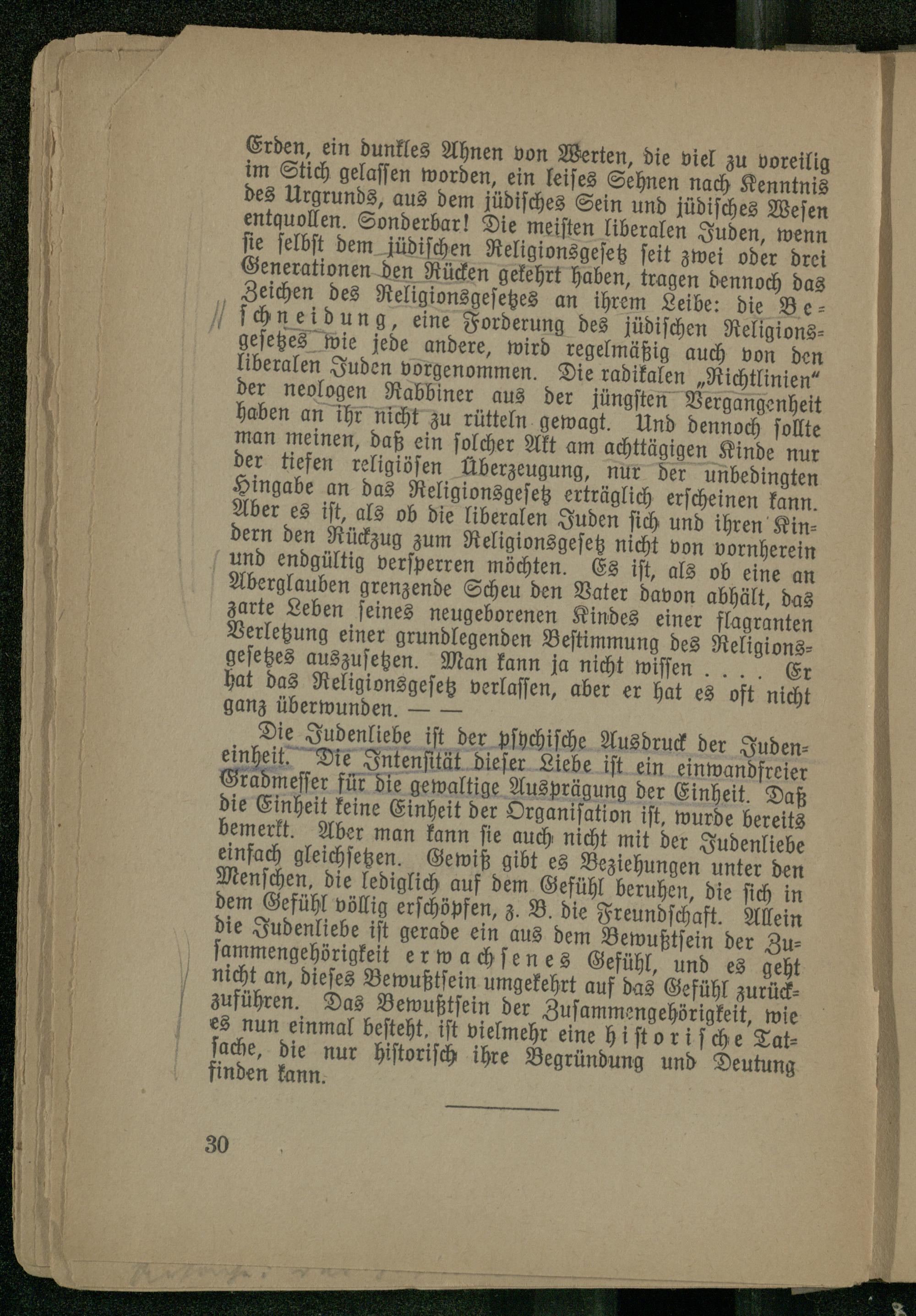 Erden, ein dunkles Ahnen von Werten, die viel zu voreilig im Stich gelassen worden, ein leises Sehnen nach Kenntnis des Urgrunds, aus dem jüdisches Sein und jüdisches Wesen entquollen. Sonderbar! Die meisten liberalen Juden, wenn sie selbst dem jüdischen Religionsgesetz seit zwei oder drei Generationen den Rücken gekehrt haben, tragen dennoch das Zeichen des Religionsgesetzes an ihrem Leibe: die Be- schneidung , ei ne Forderung des jüdischen Religionsgesetzes wie jede andere, wird regelmäßig auch von den liberalen Juden vorgenommen. Die radikalen „Richtlinien" der neologen Rabbiner aus der jüngsten Vergangenheit haben an ihr nicht zu rütteln gewagt. Und dennoch sollte man meinen, daß ein solcher Akt am achttägigen Kinde nur der tiefen religiösen Überzeugung, nur der unbedingten Hingabe an das Religionsgesetz erträglich erscheinen kann. Aber es ist, als ob die liberalen Juden sich und ihren Kindern den Rückzug zum Religionsgesetz nicht von vornherein und endgültig versperren möchten. Es ist, als ob eine an Aberglauben grenzende Scheu den Vater davon abhält, das zarte Leben seines neugeborenen Kindes einer flagranten Verletzung einer grundlegenden Bestimmung des Religionsgesetzes auszusetzen. Man kann ja nicht wissen .... Er hat das Religionsgesetz verlassen, aber er hat es oft nicht ganz überwunden.-