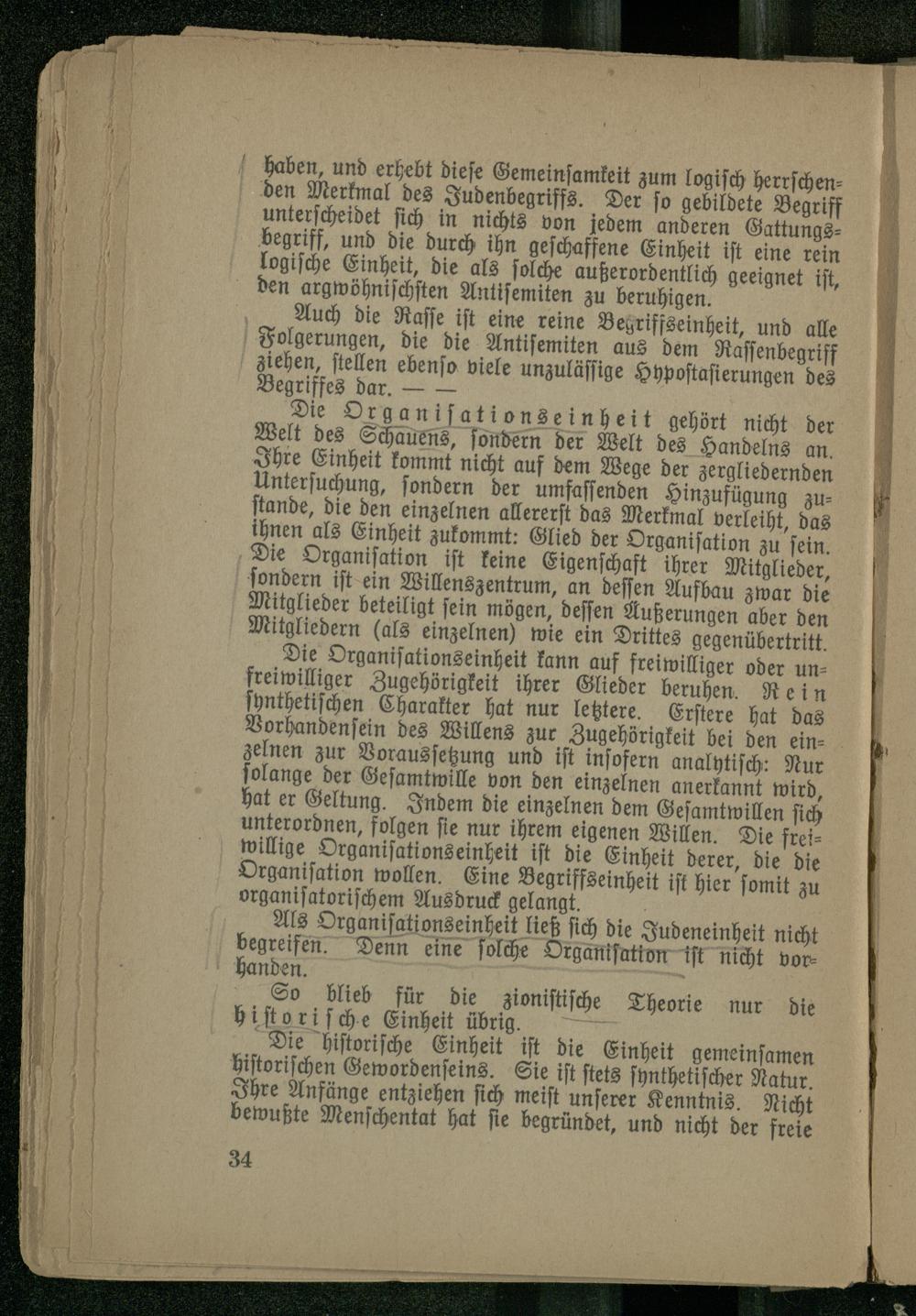 haben, und erhebt diese Gemeinsamkeit zum logisch herrschenden Merkmal des Judenbegriffs. Der so gebildete Begriff unterscheidet sich in nichts von jedem anderen Gattungsbegriff, und die durch ihn geschaffene Einheit ist eine rein logische Einheit, die als solche außerordentlich geeignet ist, den argwöhnischsten Antisemiten zu beruhigen.