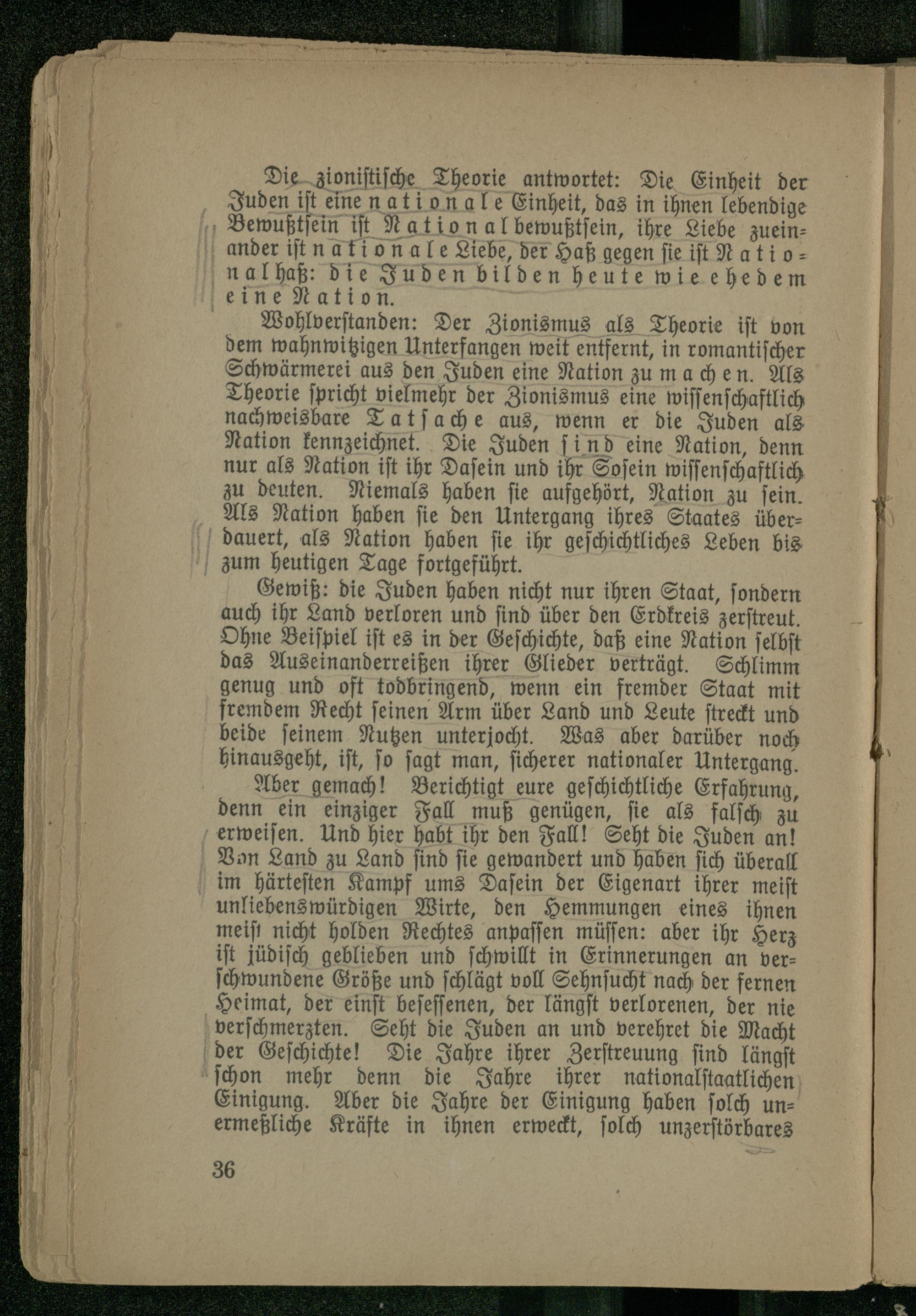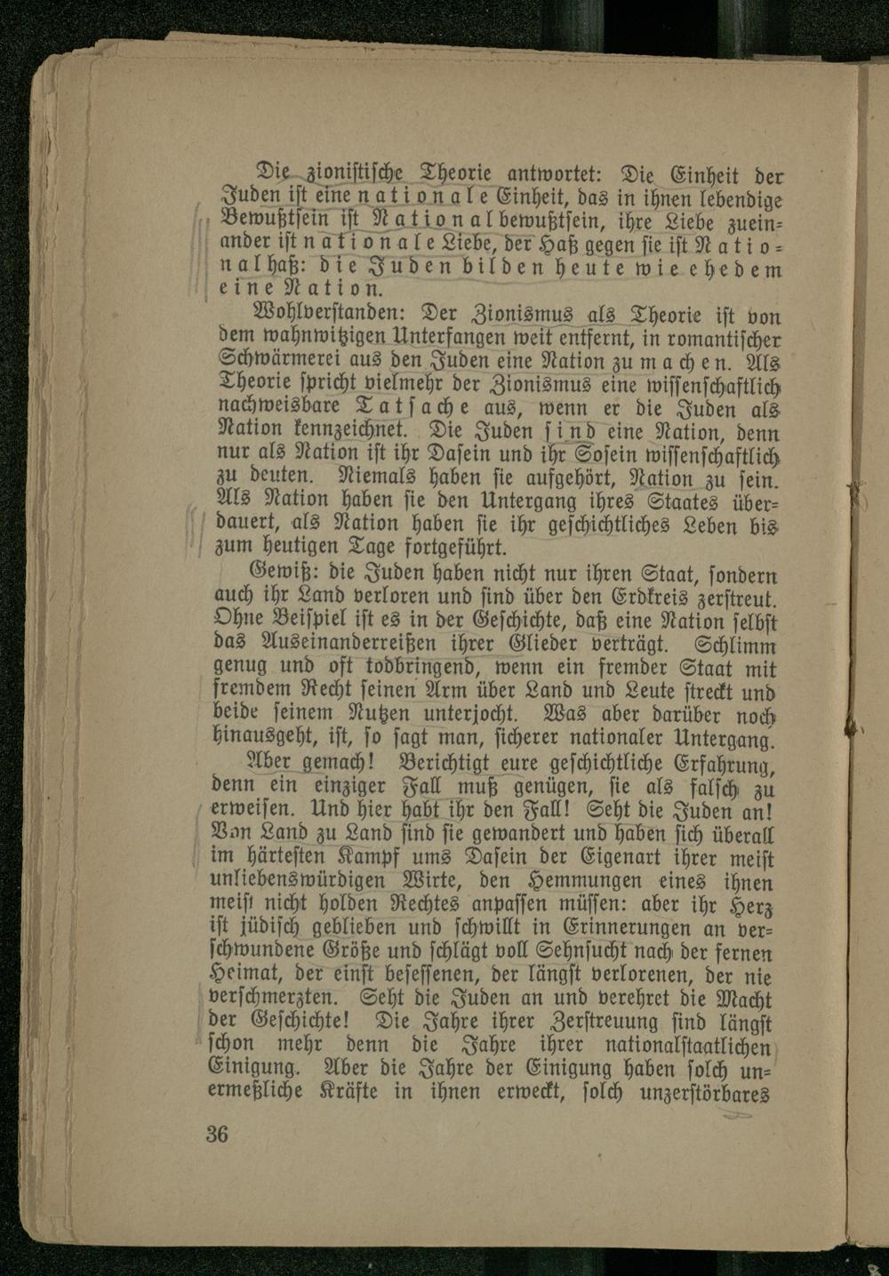 Wohlverstanden: Der Zionismus als Theorie ist von dem wahnwitzigen Unterfangen weit entfernt, in romantischer Schwärmerei aus den Juden eine Nation zumachen. Als Theorie spricht vielmehr der Zionismus eine wissenschaftlich nachweisbare Tatsache aus, wenn er die Juden als Nation kennzeichnet. Die Juden sind eine Nation, denn nur als Nation ist ihr Dasein und ihr Schein wissenschaftlich zu deuten. Niemals haben sie aufgehört, Nation zu sein. Als Nation haben sie den Untergang ihres Staates über- dauert, als Nation haben sie ihr geschichtliches Leben bis zum heutigen Tage fortgeführt.