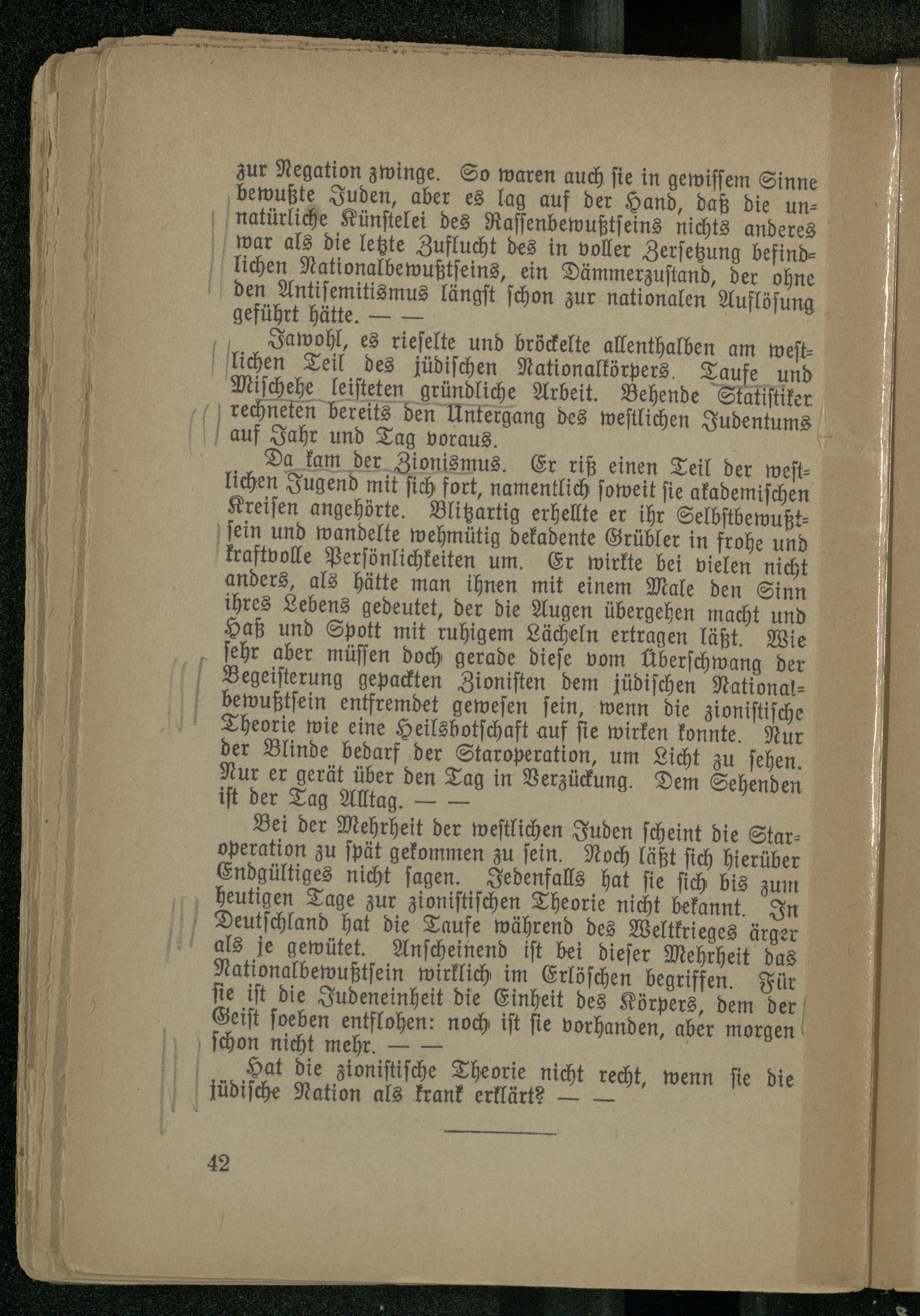 Da kam der Zionismus. Er riß einen Teil der westlichen Jugend mit sich fort, namentlich soweit sie akademischen Kreisen angehörte. Blitzartig erhellte er ihr Selbstbewußtsein und wandelte wehmütig dekadente Grübler in frohe und kraftvolle Persönlichkeiten um. Er wirkte bei vielen nicht anders, als hätte man ihnen mit einem Male den Sinn ihres Lebens gedeutet, der die Augen übergehen macht und Haß und Spott mit ruhigem Lächeln ertragen läßt. Wie sehr aber müssen doch gerade diese vom Überschwang der Begeisterung gepackten Zionisten dem jüdischen Nationalbewußtsein entfremdet gewesen sein, wenn die zionistische Theorie wie eine Heilsbotschaft auf sie wirken konnte. Nur der Blinde bedarf der Staroperation, um Licht zu sehen. Nur er gerät über den Tag in Verzückung. Dem Sehenden ist der Tag Alltag.-