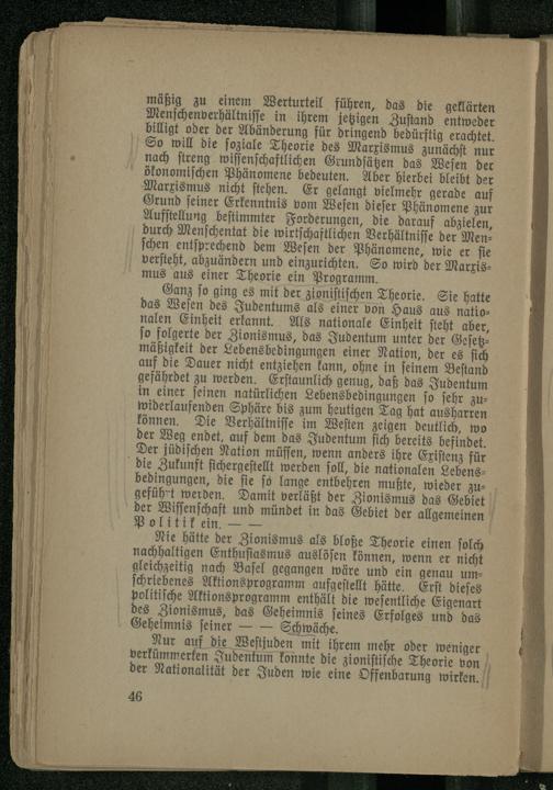 Nie hätte der Zionismus als bloße Theorie einen solch nachhaltigen Enthusiasmus auslösen können, wenn er nicht gleichzeitig nach Basel gegangen wäre und ein genau umschriebenes Aktionsprogramm ausgestellt hätte. Erst dieses politische Aktionsprogramm enthält die wesentliche Eigenart des Zionismus, das Geheimnis seines Erfolges und das Geheimnis seiner - Schwäche.