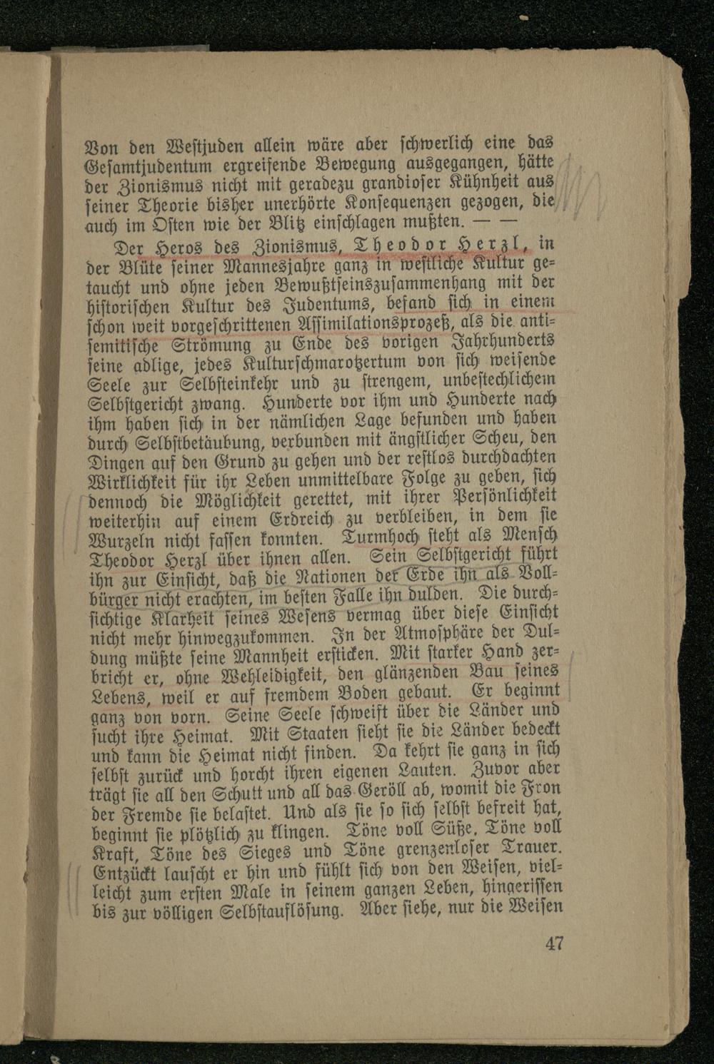 Der Heros des Zionismus, Theodor Herzl, in der Blüte seiner Mannesjahre ganz in westliche Kultur getaucht und ohne jeden Bewußtseinszusammenhang mit der historischen Kultur des Judentums, befand sich in einem schon weit vorgeschrittenen Assimilationsprozeß, als die antisemitische Strömung zu Ende des vorigen Jahrhunderts seine adlige, jedes Kulturschmarotzertum von sich weisende Seele zur Selbsteinkehr und zu strengem, unbestechlichem Selbstgericht zwang. Hunderte vor ihm und Hunderte nach ihm haben sich in der nämlichen Lage befunden und haben durch Selbstbetäubung, verbunden mit ängstlicher Scheu, den Dingen auf den Grund zu gehen und der restlos durchdachten Wirklichkeit für ihr Leben unmittelbare Folge zu geben, sich dennoch die Möglichkeit gerettet, mit ihrer Persönlichkeit weiterhin auf einem Erdreich zu verbleiben, in dem sie Wurzeln nicht fassen konnten. Turmhoch steht als Mensch Theodor Herzl über ihnen allen. Sein,Selbstgericht führt ihn zur Einsicht, daß die Nationen der Erde ihn als Vollbürger nicht erachten, im besten Falle ihn dulden. Die durchsichtige Klarheit seines Wesens vermag über diese Einsicht nicht mehr hinwegzukommen. In der Atmosphäre der Duldung müßte seine Mannheit ersticken. Mit starker Hand zerbricht er, ohne Wehleidigkeit, den glänzenden Bau seines Lebens, weil er auf fremdem Boden gebaut. Er beginnt ganz von vorn. Seine Seele schweift über die Länder und sucht ihre Heimat. Mit Staaten sieht sie dis Länder bedeckt und kann die Heimat nicht finden. Da kehrt sie ganz in sich selbst zurück und horcht ihren eigenen Lauten. Zuvor aber trägt sie all den Schutt und all das Geröll ab, womit die Fron der Fremde sie belastet. Und als sie so sich selbst befreit hat, beginnt sie plötzlich zu klingen. Töne voll Süße. Töne voll Kraft, Töne des Sieges und Töne grenzenloser Trauer. Entzückt lauscht er hin und fühlt sich von den Weisen, vielleicht zum ersten Male in seinem ganzen Leben, hingerissen bis zur völligen Selbstauslösung. Aber siehe, nur die Weisen