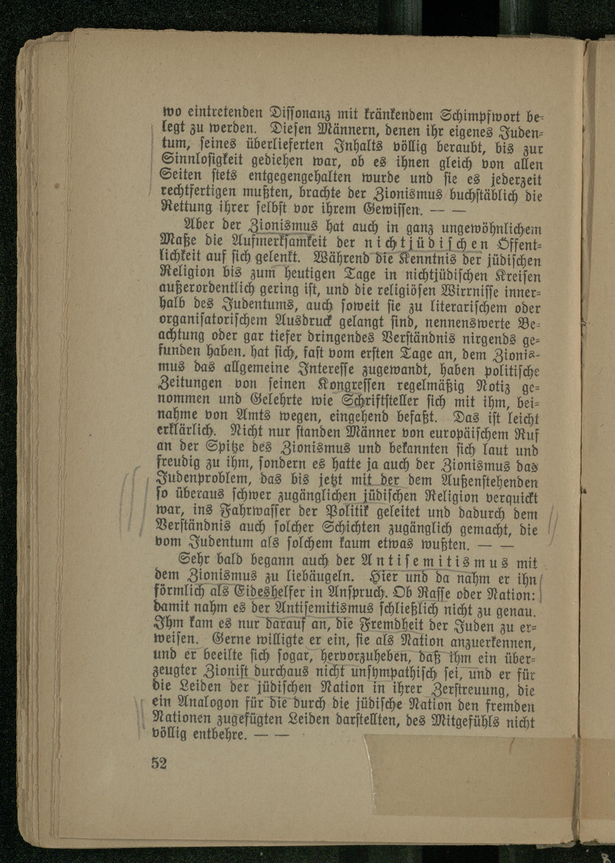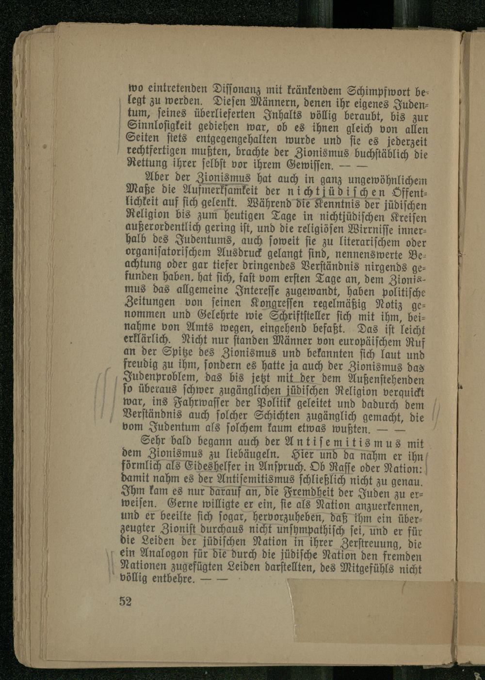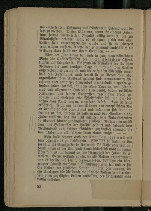 Sehr bald begann auch der Antisemitismus mit dem Zionismus zu liebäugeln. Hier und da nahm er ihn förmlich als Eideshelfer in Anspruch. Ob Rasse oder Nation: damit nahm es der Antisemitismus schließlich nicht zu genau. Ihm kam es nur darauf an, die Fremdheit der Juden zu erweisen. Gerne willigte er ein, sie als Nation anzuerkennen, und er beeilte sich sogar, hervorzuheben, daß ihm ein überzeugter Zionist durchaus nicht unsympathisch sei, und er für die Leiden der jüdischen Nation in ihrer Zerstreuung, die ein Analogon für die durch die jüdische Nation den fremden Nationen zugefügten Leiden darstellten, des Mitgefühls nicht völlig entbehre.-