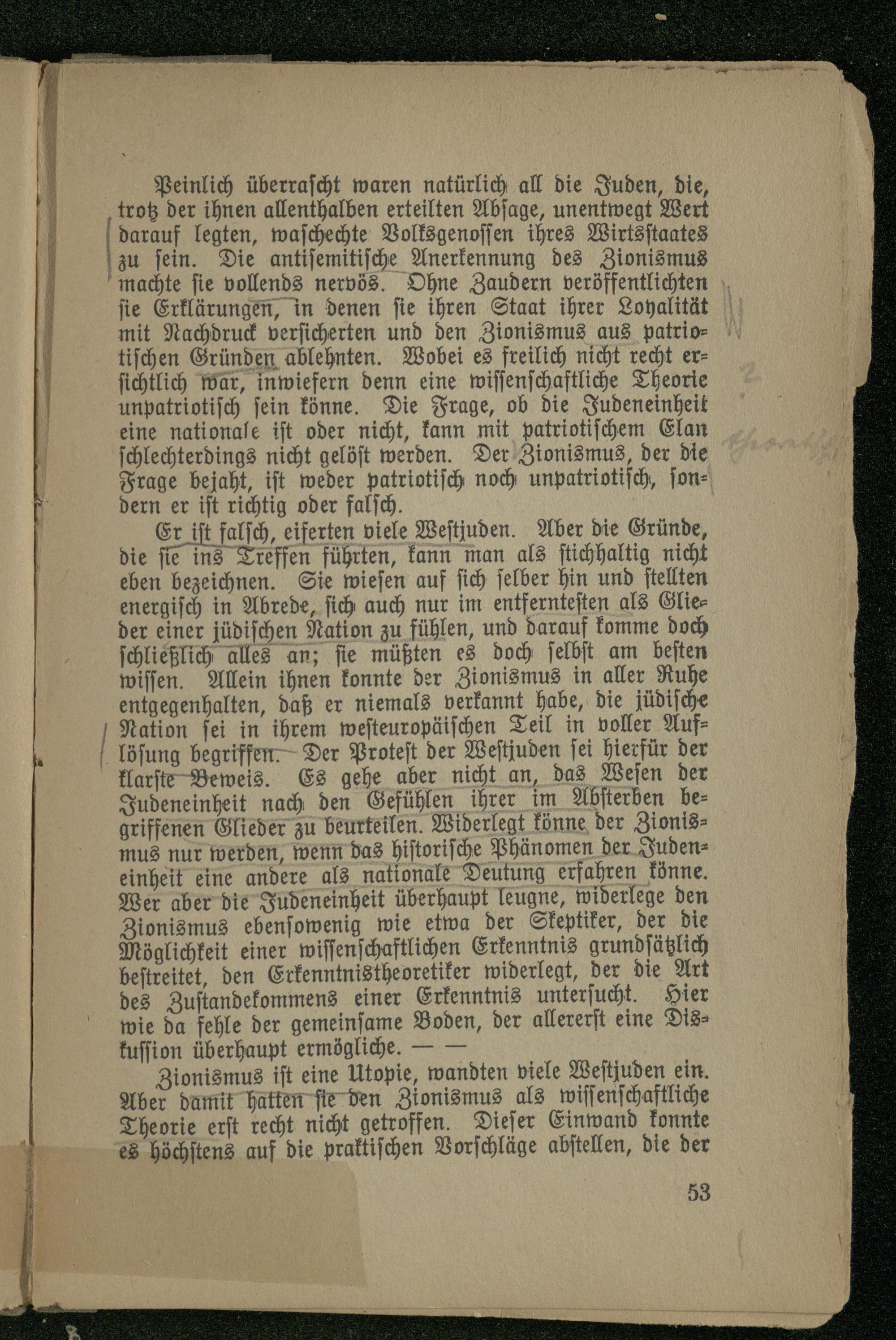Er i st falsch , eiferten viele Westjuden. Aber die Gründe, die sie ins Treffen führten, kann man als stichhaltig nicht eben bezeichnen. Sie wiesen auf sich selber hin und stellten energisch in Abrede, sich auch nur im entferntesten als Glieder einer jüdischen Nation zu fühlen, und darauf komme doch schließlich alles an; sie müßten es doch selbst am besten wissen. Allein ihnen konnte der Zionismus in aller Ruhe entgegenhalten, daß er niemals verkannt habe, die jüdische Nation sei in ihrem westeuropäischen Teil in voller Auflösung begriffen. Der Protest der Westjuden sei hierfür der klarste Beweis. Es gehe aber nicht an, das Wesen der Judeneinheit nach den Gefühlen ihrer im Absterben begriffenen Glieder zu beurteilen. Widerlegt könne der Zionismus nur werden, wenn das historische Phänomen der Judeneinheit eine andere als nationale Deutung erfahren könne. Wer aber die Judeneinheit überhaupt leugne, widerlege den Zionismus ebensowenig wie etwa der Skeptiker, der die Möglichkeit einer wissenschaftlichen Erkenntnis grundsätzlich bestreitet, den Erkenntnistheoretiker widerlegt, der die Art des Zustandekommens einer Erkenntnis untersucht. Hier wie da fehle der gemeinsame Boden, der allererst eine Diskussion überhaupt ermögliche.-