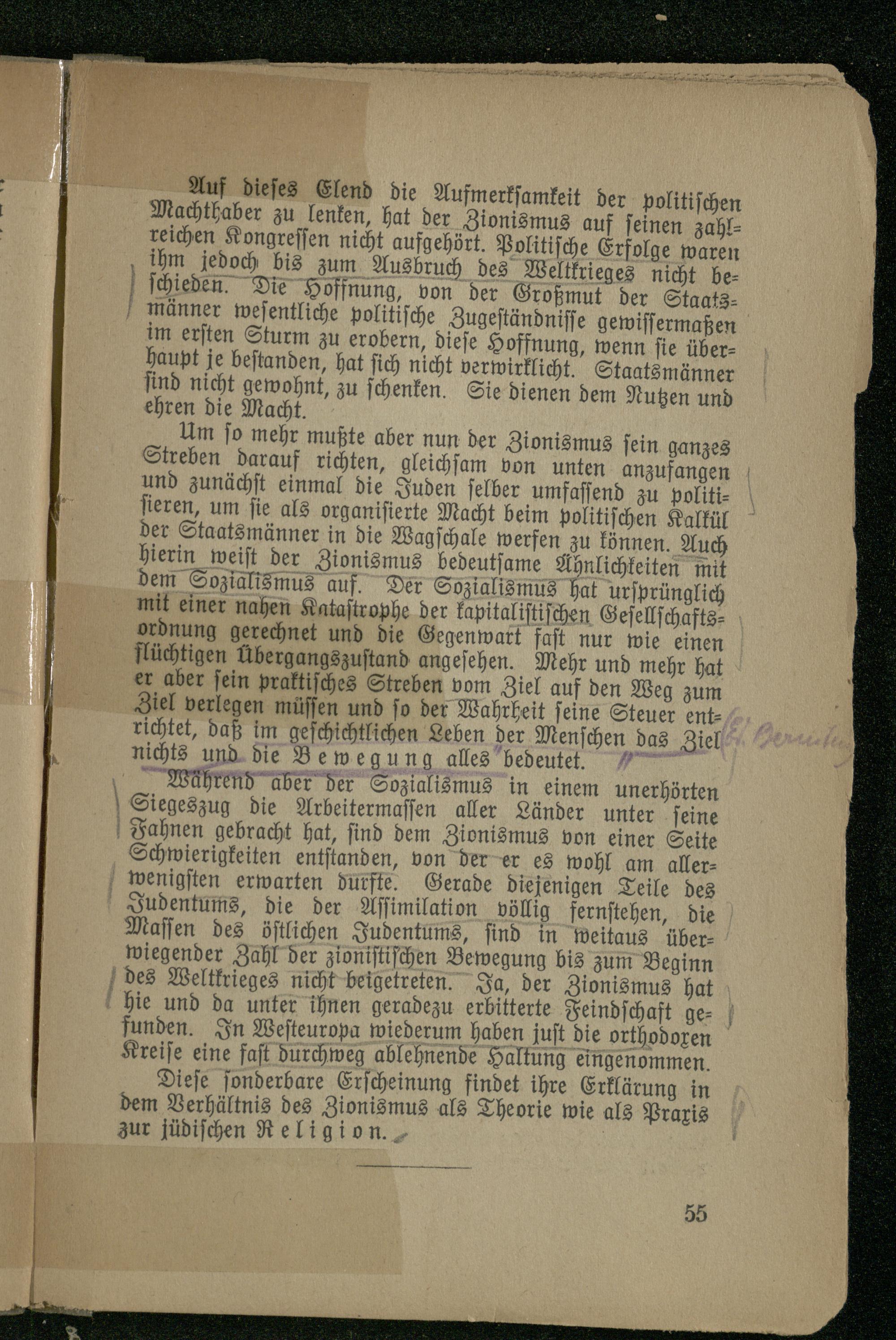 Während aber der Sozialismus in einem unerhörten Siegeszug die Arbeitermassen aller Länder unter seine Fahnen gebracht hat, sind dem Zionismus von einer Seite Schwierigkeiten entstanden, von der er es wohl am allerwenigsten erwarten durfte. Gerade diejenigen Teile des Judentums, die der Assimilation völlig fernstehen, die Masten des östlichen Judentums, sind in weitaus überwiegender Zahl der zionistischen Bewegung bis zum Beginn des Weltkrieges nicht beigetreten. Ja, der Zionismus hat hie und da unter ihnen geradezu erbitterte Feindschaft gefunden. In Westeuropa wiederum haben just die orthodoxen Kreise eine fast durchweg ablehnende Haltung eingenommen.