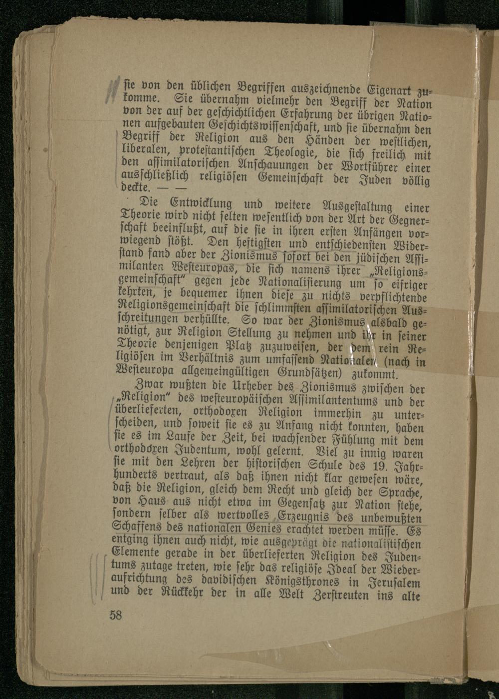 Zwar wußten die Urheber des Zionismus zwischen der „Religion" des westeuropäischen Assimilantentums und der überlieferten, orthodoxen Religion immerhin zu unterscheiden, und soweit sie es zu Anfang nicht konnten, haben sie es im Laufe der Zeit, bei wachsender Fühlung mit dem orthodoxen Judentum, wohl gelernt. Viel zu innig waren sie mit den Lehren der historischen Schule des 19. Jahrhunderts vertraut, als daß ihnen nicht klar gewesen wäre, daß die Religion, gleich dem Recht und gleich der Sprache, von Haus aus nicht etwa im Gegensatz zur Nation stehe, sondern selber als wertvolles Erzeugnis des unbewußten Schaffens des nationalen Genies erachtet werden müsse. Es entging ihnen auch nicht, wie ausgeprägt die nationalistischen Elemente gerade in der überlieferten Religion des Juden- tums zutage treten, wie sehr das religiöse Ideal der Wiederaufrichtung des davidischen Königsthrones in Jerusalem und der Rückkehr der in alle Welt Zerstreuten ins alte