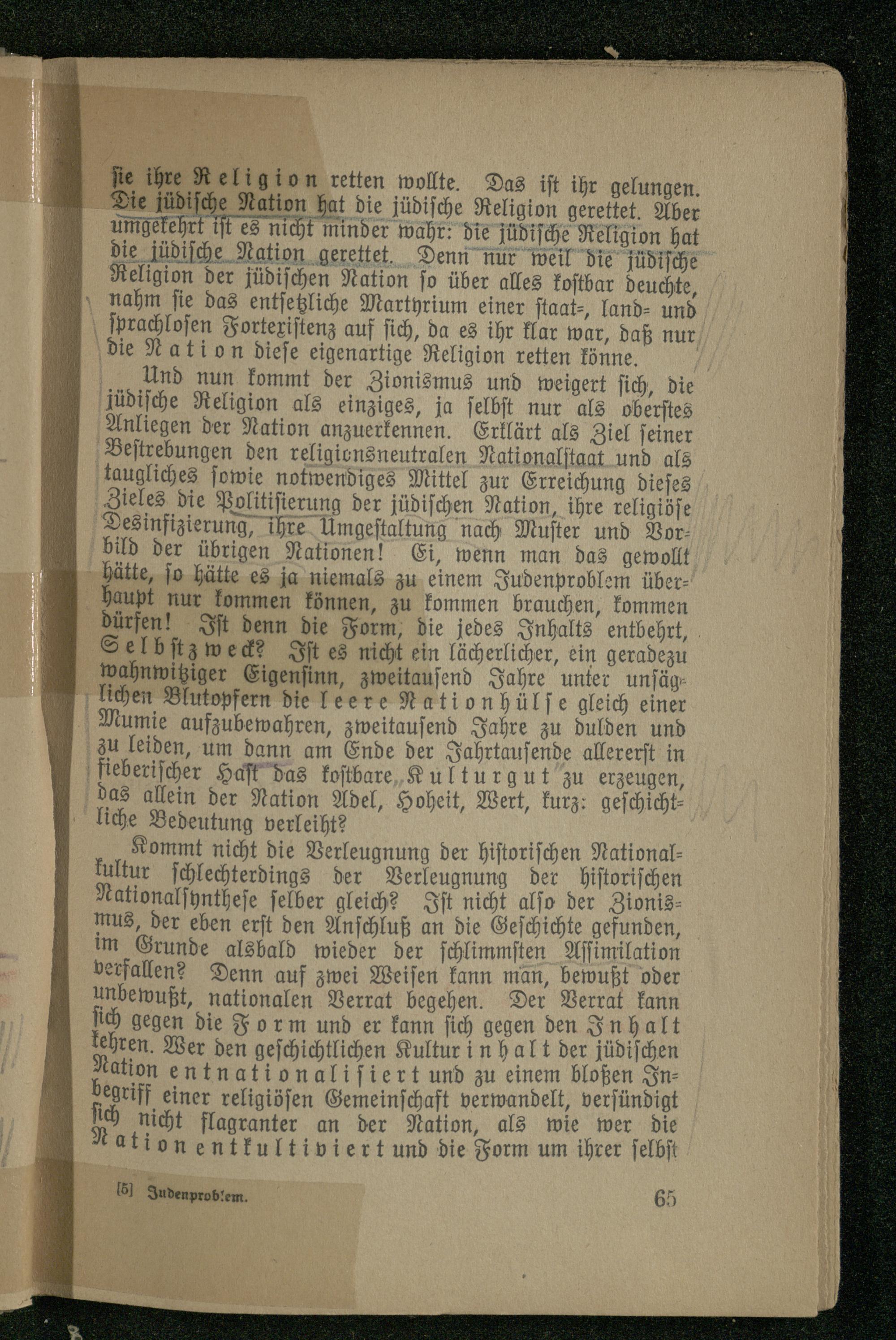 Und nun kommt der Zionismus und weigert sich, die jüdische Religion als einziges, ja selbst nur als oberstes Anliegen der Nation anzuerkennen. Erklärt als Ziel seiner Bestrebungen den religionsneutralen Nationalstaat und als taugliches sowie notwendiges Mittel zur Erreichung dieses Zieles die Politisierung der jüdischen Nation, ihre religiöse Desinfizierung, ihre Umgestaltung nach Muster und Vorbild der übrigen Nationen! Ei, wenn man das gewollt hätte, so hätte es ja niemals zu einem Judenproblem überhaupt nur kommen können, zu kommen brauchen, kommen dürfen! Ist denn die Form, die jedes Inhalts entbehrt, Selbstzweck? Ist es nicht ein lächerlicher, ein geradezu wahnwitziger Eigensinn, zweitausend Jahre unter unsäglichen Blutopfern die leere Nationhülse gleich einer Mumie aufzubewahren, zweitausend Jahre zu dulden und zu leiden, um dann am Ende der Jahrtausende allerech in fieberischer Hast das kostbare Kulturgut zu erzeugen, das allein der Nation Adel, Hoheit, Wert, kurz: geschichtliche Bedeutung verleiht?