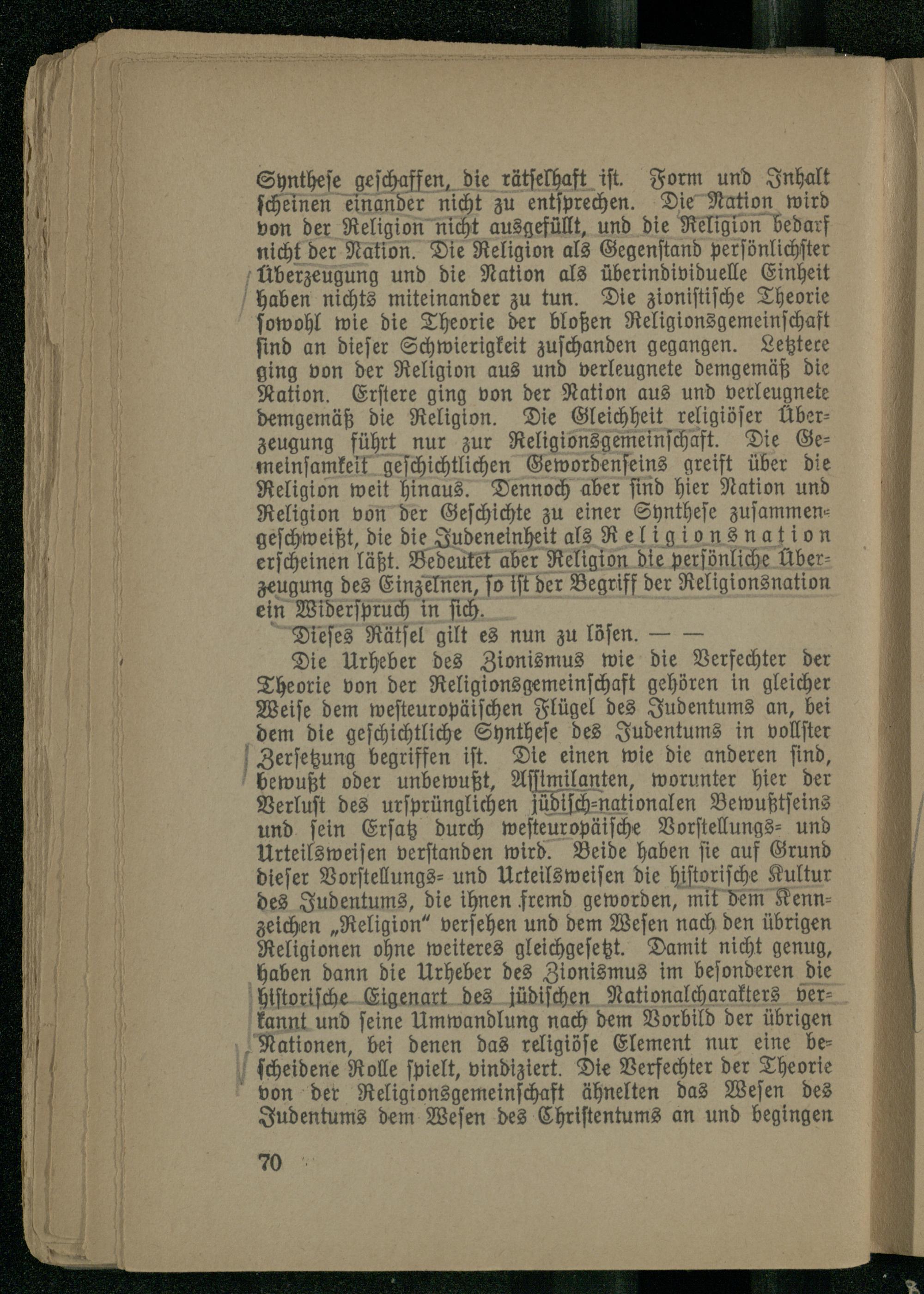 Synthese geschaffen, die rätselhaft ist. Form und Inhalt scheinen einander nicht zu entsprechen. Die Nation wird von der Religion nicht ausgefüllt, und die Religion bedarf nicht der Nation. Die Religion als Gegenstand persönlichster Überzeugung und die Nation als überindividuelle Einheit haben nichts miteinander zu tun. Die zionistische Theorie sowohl wie die Theorie der bloßen Religionsgemeinschaft sind an dieser Schwierigkeit zuschanden gegangen. Letztere ging von der Religion aus und verleugnete demgemäß die Nation. Erstere ging von der Nation aus und verleugnete demgemäß die Religion. Die Gleichheit religiöser Überzeugung führt nur zur Religionsgemeinschäft. Die Gemeinsamkeit geschichtlichen Gewordenseins greift über die Religion weit hinaus. Dennoch aber sind hier Nation und Religion von der Geschichte zu einer Synthese zusammen- geschweißt, die die Judeneinheit als Religionsnation erscheinen läßt. Bedeutet aber Religion die persönliche Überzeugung des Einzelnen, so ist der Begriff der Religionsnation ein Widerspruch in sich.