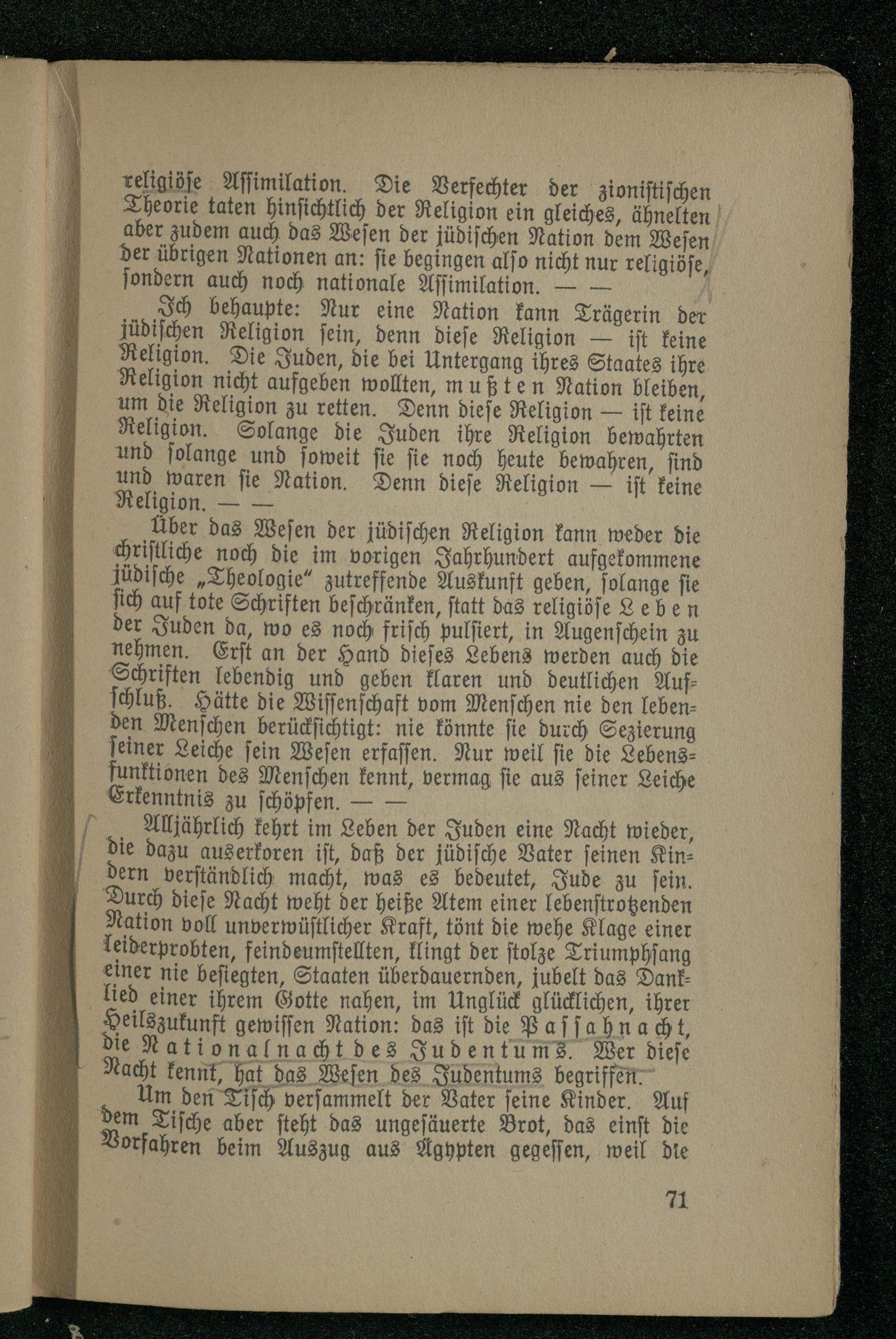 Alljährlich kehrt im Leben der Juden eine Nacht wieder, die dazu auserkoren ist, daß der jüdische Vater seinen Kindern verständlich macht, was es bedeutet, Jude zu sein. Durch diese Nacht weht der heiße Atem einer lebenstrotzenden Nation voll unverwüstlicher Kraft, tönt die wehe Klage einer leiderprobten, feindeumstellten, klingt der stolze Triumphsang einer nie besiegten, Staaten überdauernden, jubelt das Danklied einer ihrem Gotte nahen, im Unglück glücklichen, ihrer Heilszukunft gewissen Nation: das ist die Passahnacht, die Nationalnacht des Judentumse . Wer dies Nacht kennt, hat das Wesen des Judentums begriffen.