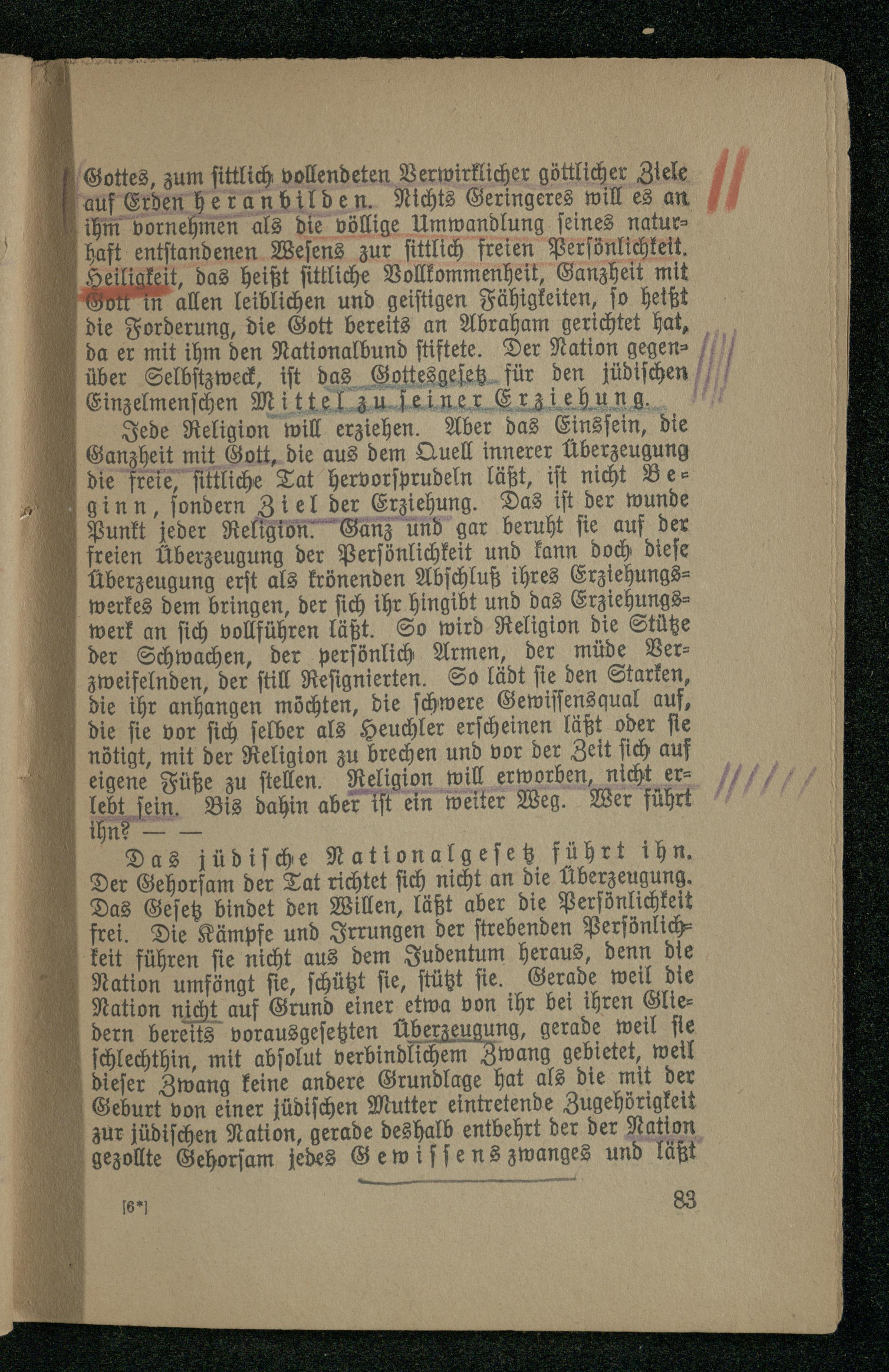 Gottes, zum sittlich vollendeten Verwirklicher göttlicher Ziele auf Erden heranbilden. Nichts Geringeres will es an ihm vornehmen als die völlige Umwandlung seines naturhaft entstandenen Wesens zur sittlich freien Persönlichkeit. Heiligkeit, das heißt sittliche Vollkommenheit, Ganzheit mit Gott in allen leiblichen und geistigen Fähigkeiten, so he die Forderung, die Gott bereits an Abraham gerichtet hat, da er mit ihm den Nationalbund stiftete. Der Nation gegen- über Selbstzweck, ist dos Gottesgesetz für den jüdischen Einzelmenschen Mittel zu seiner Erziehung.''