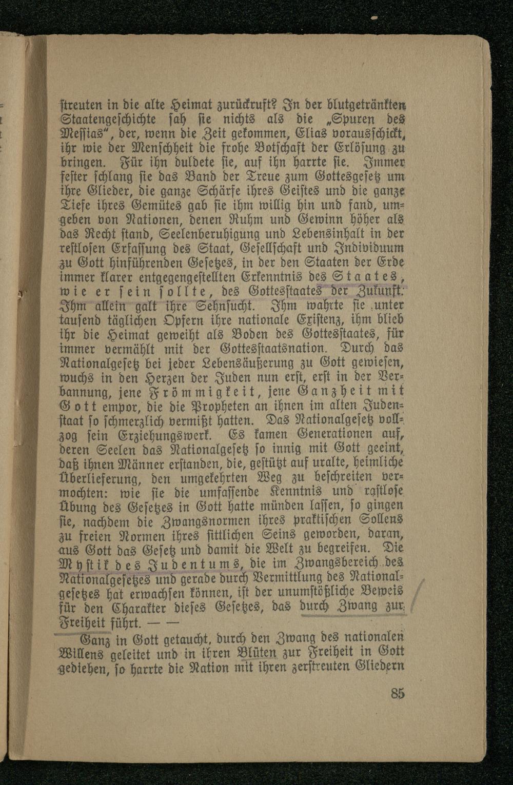 streuten in die alte Heimat zurückruft? In der blutgetränkten Staatengeschichte sah sie nichts als die „Spuren des Messias", der, wenn die Zeit gekommen, Elias vorausschickt, ihr wie der Menschheit die frohe Botschaft der Erlösung zu bringen. Für ihn duldete sie, auf ihn harrte sie. Immer fester schlang sie das Band der Treue zum Gottesgesetz um ihre Glieder, die ganze Schärfe ihres Geistes und die ganze Tiefe ihres Gemütes gab sie ihm willig hin und fand, umgeben von Nationen, denen Ruhm und Gewinn höher als das Recht stand, Seelenberuhigung und Lebensinhalt in der restlosen Erfassung des Staat, Gesellschaft und Individuum zu Gott hinführenden Gesetzes, in der den Staaten der Erde immer klarer entgegengestellten Erkenntnis des Staates, wie er sein sollte, des Gottesstaates der Zukunft. Ihm allein galt ihre Sehnsucht. Ihm wahrte sie unter tausend täglichen Opfern ihre nationale Existenz, ihm blieb ihr die Heimat geweiht als Boden des Gottesstaates, für immer vermählt mit der Gottesstaatsnation. Durch das Nationalgesetz bei jeder Lebensäußerung zu Gott gewiesen, wuchs in den Herzen der Juden nun erst, erst in der Verbannung, jene Frömmigkeit, jene Ganzheit mit Gott empor, die die Propheten an ihnen im alten Judenstaat so schmerzlich vermißt hatten. Das Nationalgesetz vollzog sein Erziehungswerk. Es kamen Generationen auf, deren Seelen das Nationalgesetz so innig mit Gott geeint, daß ihnen Männer erstanden, die, gestützt auf uralte, heimliche Überlieferung, den umgekehrten Weg zu beschreiten vermochten: wie sie die umfassende Kenntnis und rastlose Übung des Gesetzes in Gott hatte münden lassen, so gingen sie, nachdem die Zwangsnormen ihres praktischen Sollens Zu freien Normen ihres sittlichen Seins geworden, daran, aus Gott das Gesetz und damit die Welt zu begreifen. Die Mystik des Judentums, die im Zwangsbereich des Nationalgesetzes und gerade durch Vermittlung des Nationalgesetzes hat erwachsen können, ist der unumstößliche Beweis für den Charakter dieses Gesetzes, das durch Zwang zur Freiheit führt.-