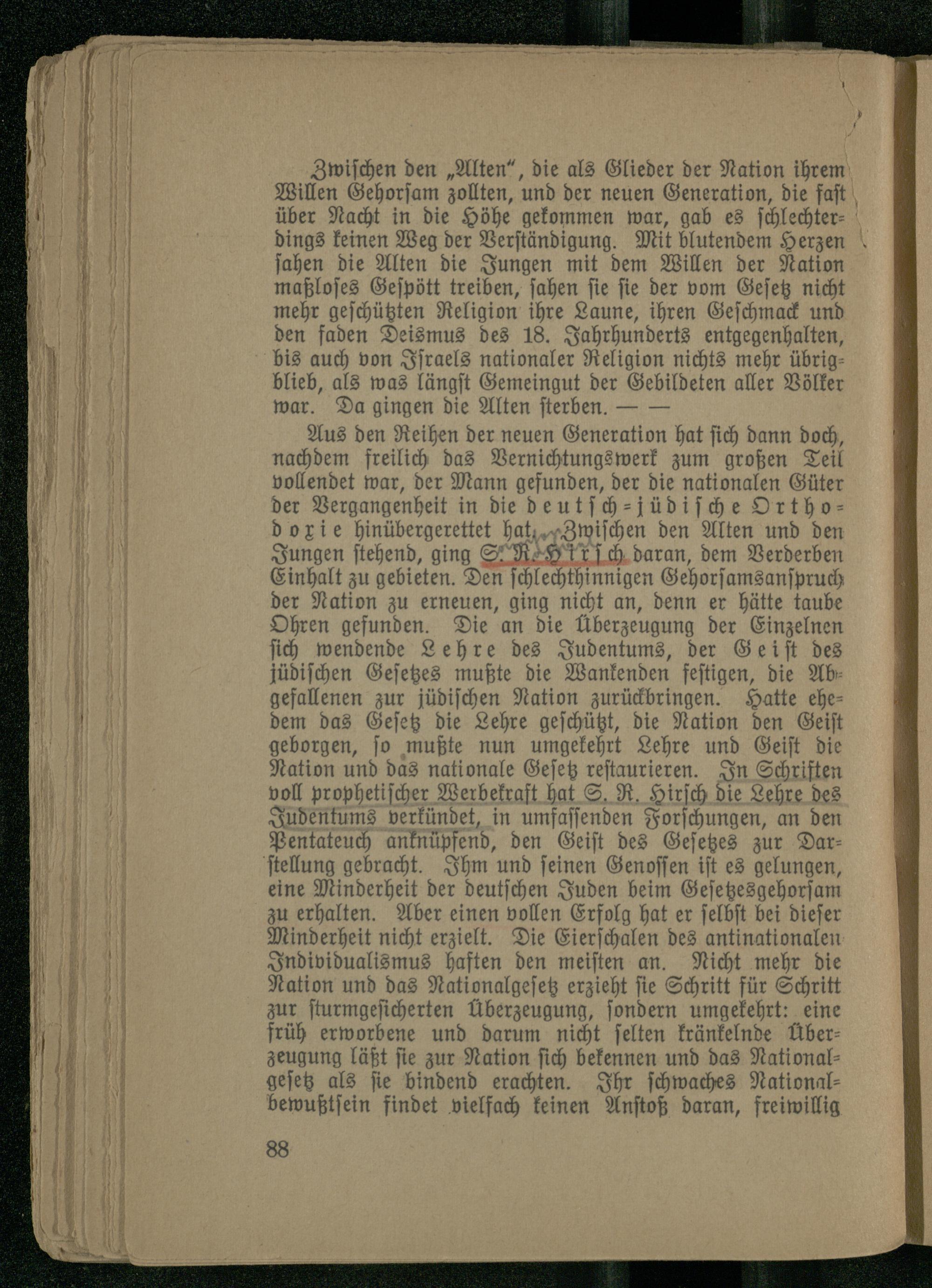 Zwischen den „Alten", die als Glieder der Nation ihrem Willen Gehorsam zollten, und der neuen Generation, die fast über Nacht in die Höhe gekommen war, gab es schlechterdings keinen Weg der Verständigung. Mit blutendem Herzen sahen die Alten die Jungen mit dem Willen der Nation maßloses Gespött treiben, sahen sie sie der vom Gesetz nicht mehr geschützten Religion ihre Laune, ihren Geschmack und den faden Deismus des 18 . Jahrhunderts entgegenhalten, bis auch von Israels nationaler Religion nichts mehr übrigblieb, als was längst Gemeingut der Gebildeten aller Völker