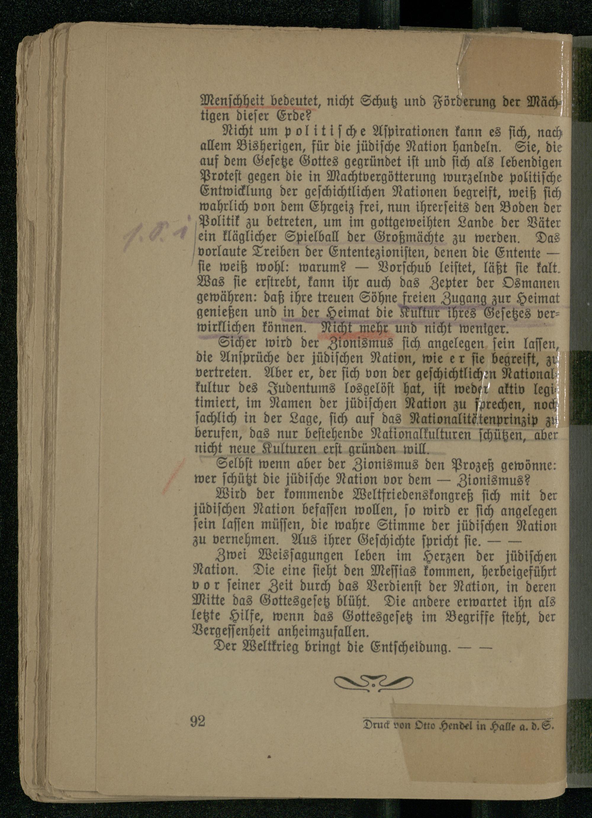 Sicher wird der Zionismus sich angelegen sein lasten, die Ansprüche der jüdischen Nation, wie er sie begreift, zu vertreten. Aber er, der sich von der geschichtlichen National- kultur des Judentums losgelöst hat, ist weder aktiv legi- timiert, im Namen der jüdischen Nation zu sprechen, noch sachlich in der Lage, sich auf das Nationalitätenprinzip zu berufen, das nur bestehende Nationalkulturen schützen, aber nicht neue Kulturen erst gründen will.