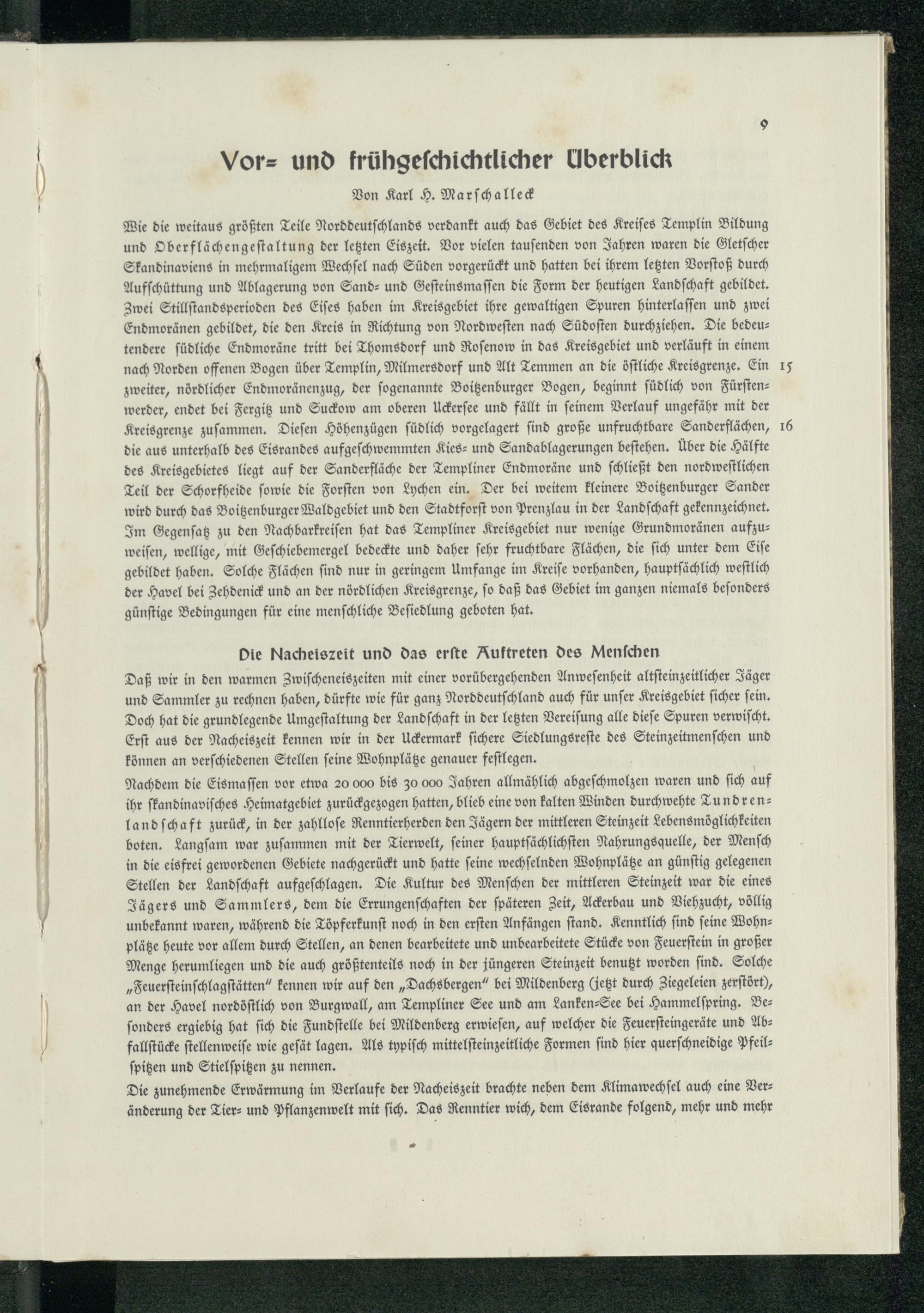 Daß wir in den warmen Zwiſcheneiszeiten mit einer vorübergehenden Anweſenheit altſtein zeitlicher Jäger und Sammler zu rechnen haben, dürfte wie für ganz Norddeutſchland auch für unſer Kreisgebiet ſicher ſein. Doch hat die grundlegende Umgeſtaltung der Landſchaft in der letzten Vereiſung alle dieſe Spuren verwiſcht. Erſt aus der Nacheiszeit kennen wir in der Uckermark ſichere Siedlungsreſte des Steinzeitmenſchen und können an verſchiedenen Stellen ſeine Wohnplätze genauer feſtlegen.