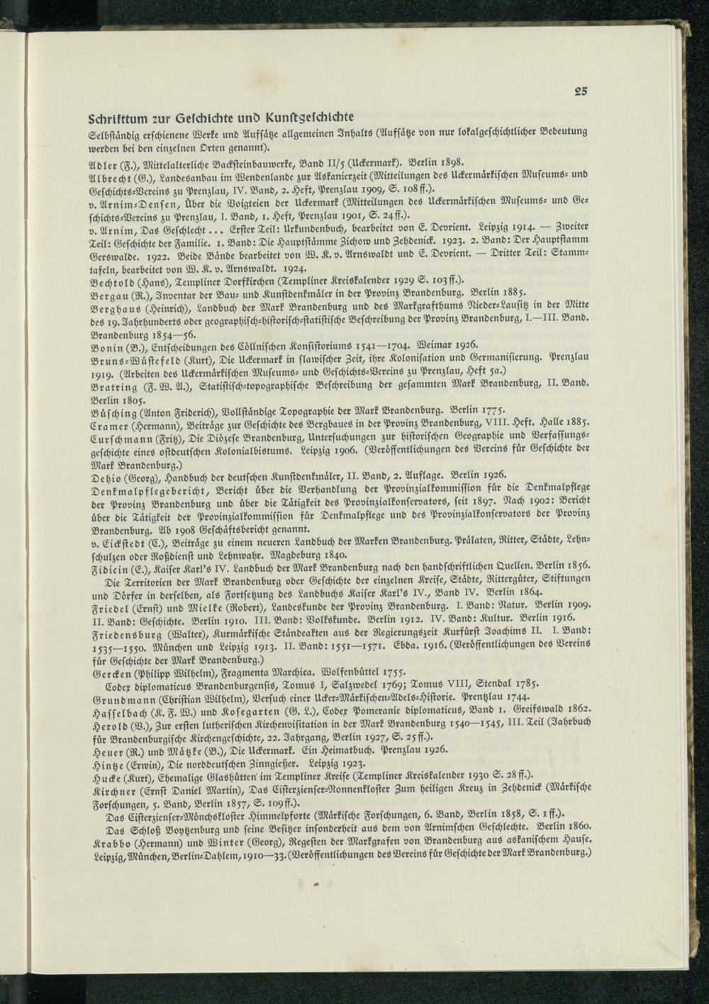 Adler(F), Mittelalterliche Backſteinbauwerke, Band Il /⸗(Uckermark ). Berlin 1898. Albrecht(G), Landesanbau im Wendenlande zur Askanierzeit(Mitteilungen des Uckermaͤrkiſchen Muſeums⸗ und Geſchichts⸗Vereins zu Prenzlau , IV. Band, 2. Heft, Prenzlau 1909, S. 108 ff). v. Arnim-Denſen, Über die Voigteien der Uckermark (Mitteilungen des Uckermaͤrkiſchen Muſeums⸗ und Geſchichts-Vereins zu Prenzlau , J. Band, 1. Heft, Prenzlau 1901, S; 24 ff). v. Arnim, Das Geſchlecht... Erſter Teil: Urkundenbuch, bearbeitet von E. Devrient. Leipzig 1914.— Zweiter Teil: Geſchichte der Familie. 1. Band: Die Hauptſtaͤmme Zichow und Zehdenick . 1923. 2. Band: Der Hauptſtamm Gerswalde . 1922. Beide Baͤnde bearbeitet von W. K. v. Arnswaldt und E. Devrient.— Dritter Teil: Stammtafeln, bearbeitet von W. K. v. Arnswaldt. 1924. Bechtold(Hans), Templiner Dorfkirchen(Templiner Kreiskalender 1929 S. 103 f.). Bergau(RM, Inventar der Bau⸗ und Kunſtdenkmaͤler in der Provinz Brandenburg . Berlin 1885. Berghaus(Heinrich, Landbuch der Mark Brandenburg und des Markgrafthums Nieder⸗Lauſitz in der Mitte des 19. Jahrhunderts oder geographiſch⸗hiſtoriſch⸗ſtatiſtiſche Beſchreibung der Provinz Brandenburg , J.= III. Band. Brandenburg 1854— 56 . Bonin(B.), Entſcheidungen des Coͤllniſchen Konſiſtoriums 1541— 1704. Weimar 1926. Bruns⸗-Wuͤſte feld(Kurt), Die Uckermark in ſlawiſcher Zeit, ihre Koloniſation und Germaniſierung. Prenzlau 1919.(Arbeiten des Uckermaͤrkiſchen Muſeums⸗ und Geſchichts⸗Vereins zu Prenzlau , Heft 5a.) Bratring(F. W. A), Statiſtiſch⸗topographiſche Beſchreibung der geſammten Mark Brandenburg, II. Band. Berlin 1805. Buͤſching (Anton Friderich), Vollſtaͤndige Topographie der Mark Brandenburg. Berlin 1775. Cramer(Hermann), Beiträge zur Geſchichte des Bergbaues in der Provinz Brandenburg , VIII. Heft. Halle 1885. Curſchmann(Fritz,, Die Diözeſe Brandenburg, Unterſuchungen zur hiſtoriſchen Geographie und Verfaſſungsgeſchichte eines oſtdeutſchen Kolonialbistums. Leipzig 1906.(Veroͤffentlichungen des Vereins für Geſchichte der Mark Brandenburg.) Dehio(Georg), Handbuch der deutſchen Kunſtdenkmaͤler , II. Band, 2. Auflage. Berlin 1926. Denkmalpflegebericht, Bericht über die Verhandlung der Provinzialkommiſſion fuͤr die Denkmalpflege der Provinz Brandenburg und über die Tätigkeit des Provinzialkonſervators, ſeit 1897. Nach 1902: Bericht über die Taͤtigkeit der Provinzialkommiſſion für Denkmalpflege und des Provinzialkonſervators der Provinz Brandenburg . Ab 1908 Geſchaͤftsbericht genannt. v. Eickſtedt(C), Beiträge zu einem neueren Landbuch der Marken Brandenburg. Praͤlaten, Ritter, Staͤdte, Lehnſchulzen oder Roßdienſt und Lehnwahr. Magdeburg 1840. Fidicin(E), Kaiſer Karl's IV. Landbuch der Mark Brandenburg nach den handſchriftlichen Quellen. Berlin 1856.
